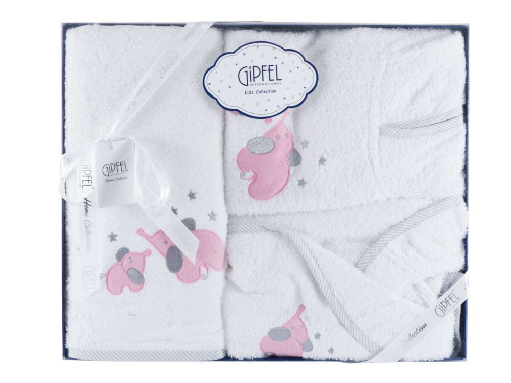 Набор GIPFEL ELEPHANT 40755. В наборе полотенце размером 70х140 см, пончо, халат. Все вещи выполнены из белого 100% хлопка с изображением забавных розовых слоников. Упакован набор в подарочную упаковку с фирменным логотипом Gipfel.