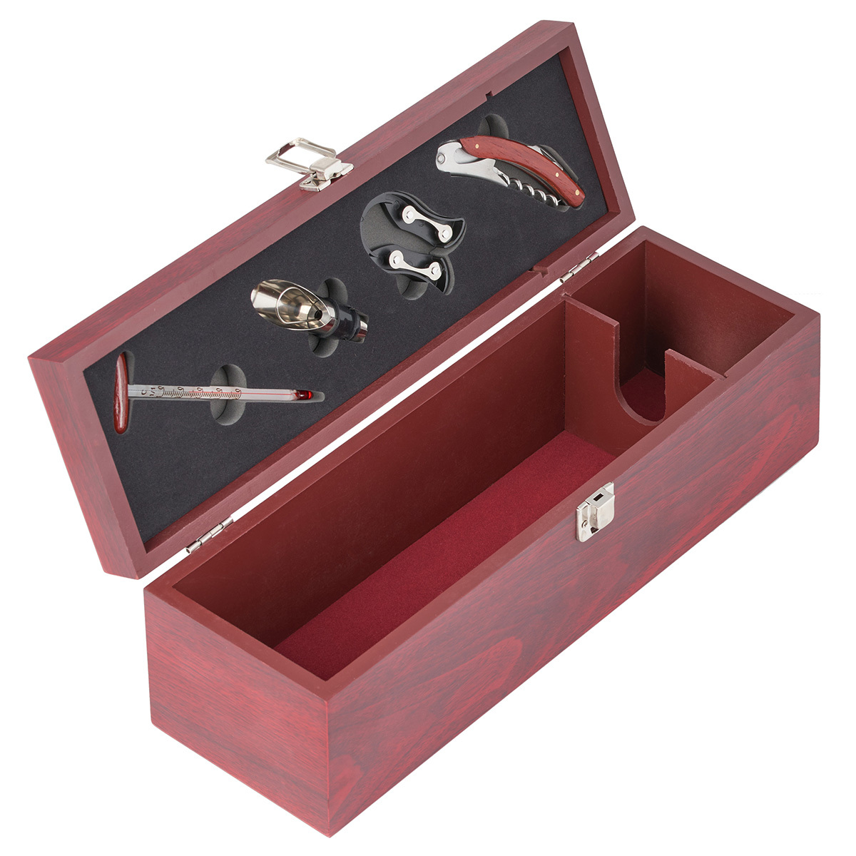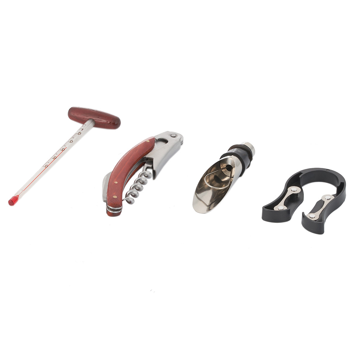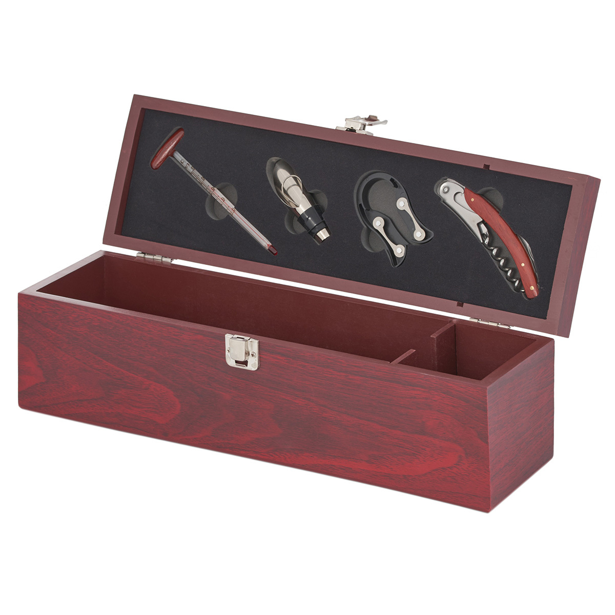 В комплекте 4 аксессуара в деревянном футляре: аэратор с функцией воронки, многофункциональная открывалка, специальный термометр и нож для срезания фольги с горлышка бутылки. Данные приспособления позволяют быстро открыть вино и сделать его хранение более эффективным. В деревянный футляр помещается бутылка вина.