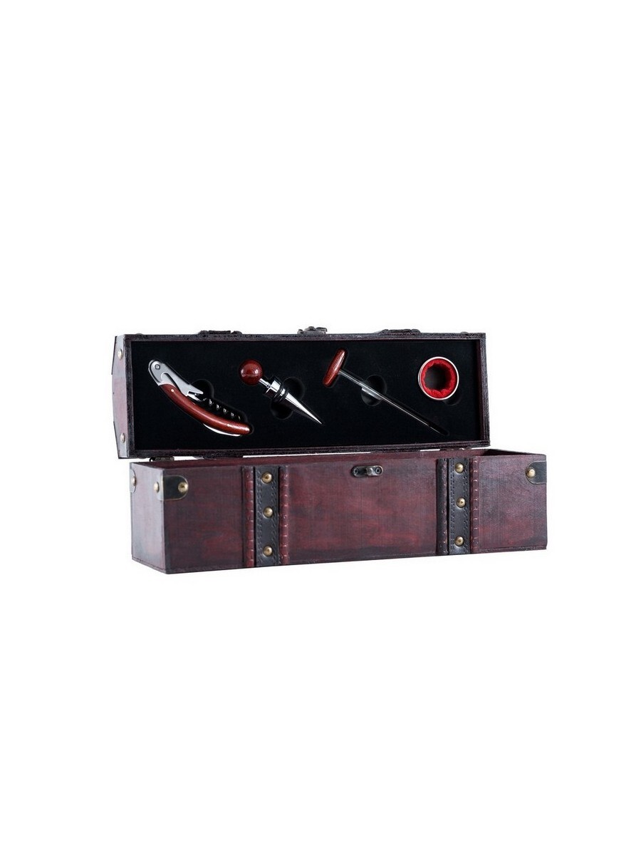 Набор винных аксессуаров Gipfel 9628. В наборе 4 предмета: каплеуловитель, пробка, штопор, термометр. Набор упакован в деревянный ящик. Размер набора 34х10,5х13 см.