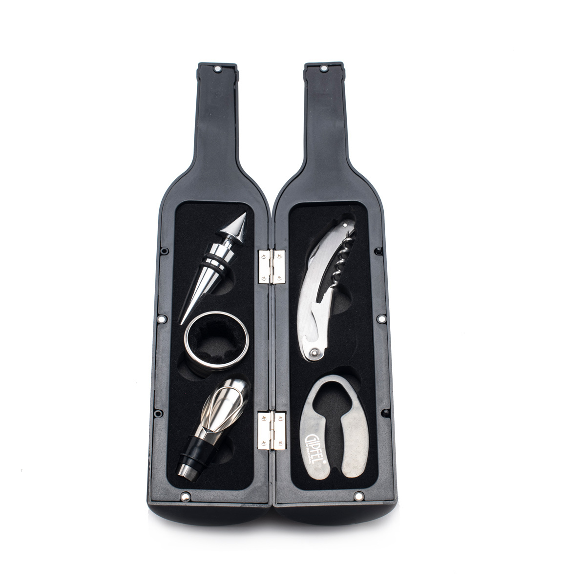9629 Gipfel Набор винных аксессуаров из 5 предметов в кейсе в форме бутылки. Материал: пластик, сплав цинка, нерж сталь. Цвет: черный