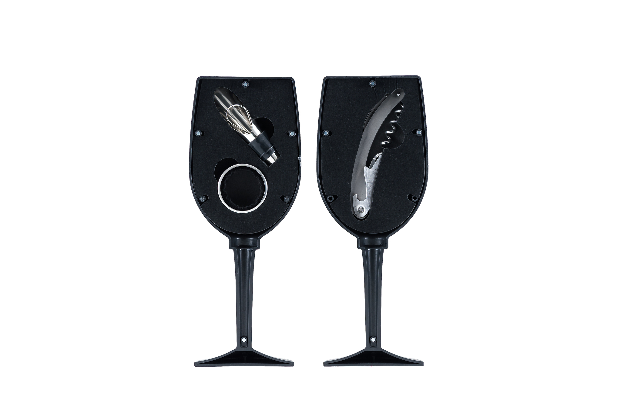 Набор винных аксессуаров Gipfel 9630. Набор состоит из 3 предметов в кейсе в форме бокала. В комплекте: штопор, воротник, кольцо.