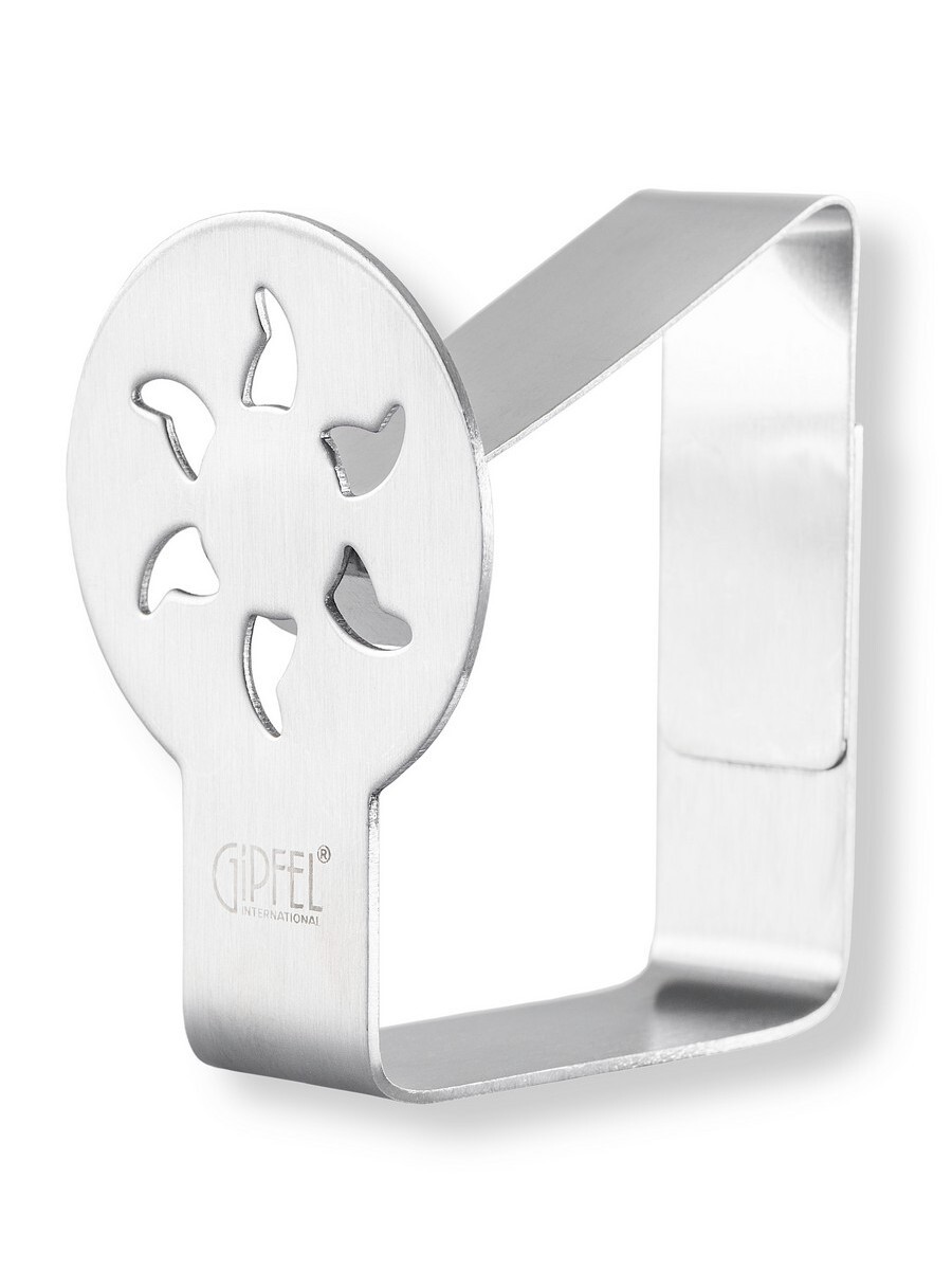 Набор зажимов для скатертей GIPFEL 6068. В наборе 4 зажима. Размер 5 см. Они прочно фиксируют скатерть по периметру стола. Сделаны из нержавеющей стали. На верхней стороне резной рисунок в виде солнышка и фирменный логотип GIPFEL.