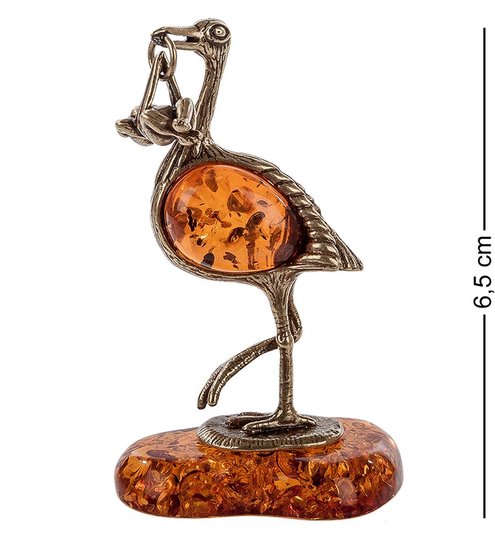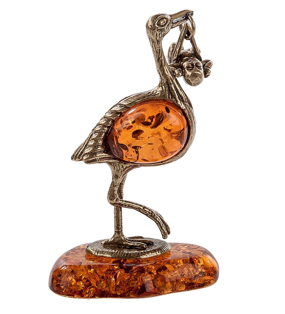 Аист, сделанный из латуни, расположился на овальной янтарной подставке. Одна из его лап приподнята, а в клюве – колечко с карабином, за который подцеплена матерчатая люлька с новорожденным. У аиста короткий хвост и большое круглое тело, которое оформлено в виде янтарного шарика оранжевого цвета.