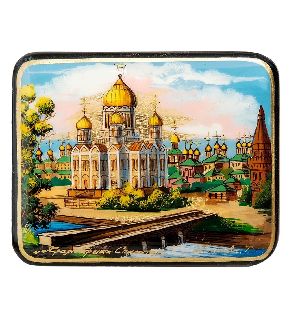 Шкатулка «Храм Христа Спасителя» изображает первоначальное здание, сооруженное в 19-м веке. Над Москвой – чистое небо, еще не смешавшееся с канцерогенными выхлопами. К высокому храму с огромным золотым куполом ведет небольшой каменный мост. На заднем плане видна одна из башен Кремля и Храм Василия Блаженного. Вокруг зданий много зеленых деревьев и кустарников. На миниатюре много синего цвета: Москва-река выполнена теми же красками, что и небо над Кремлем.