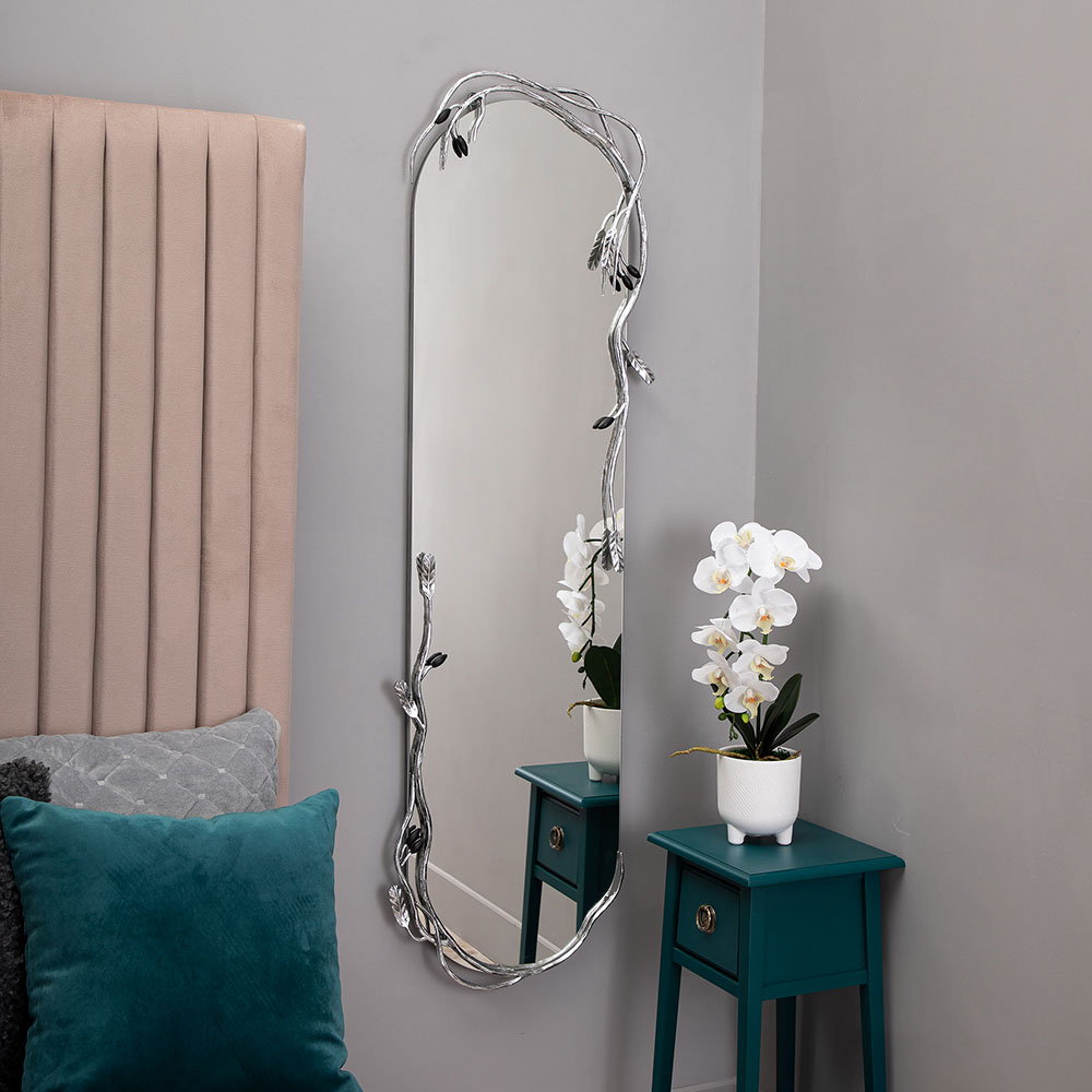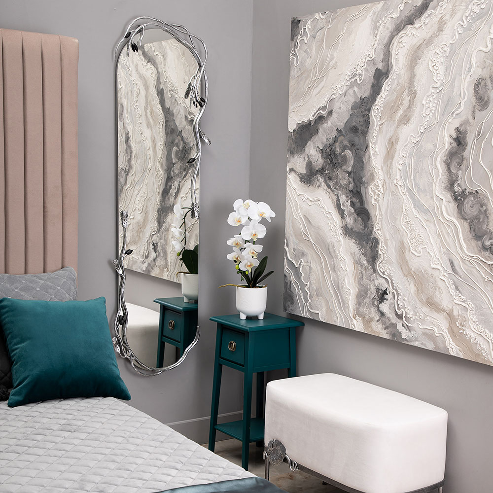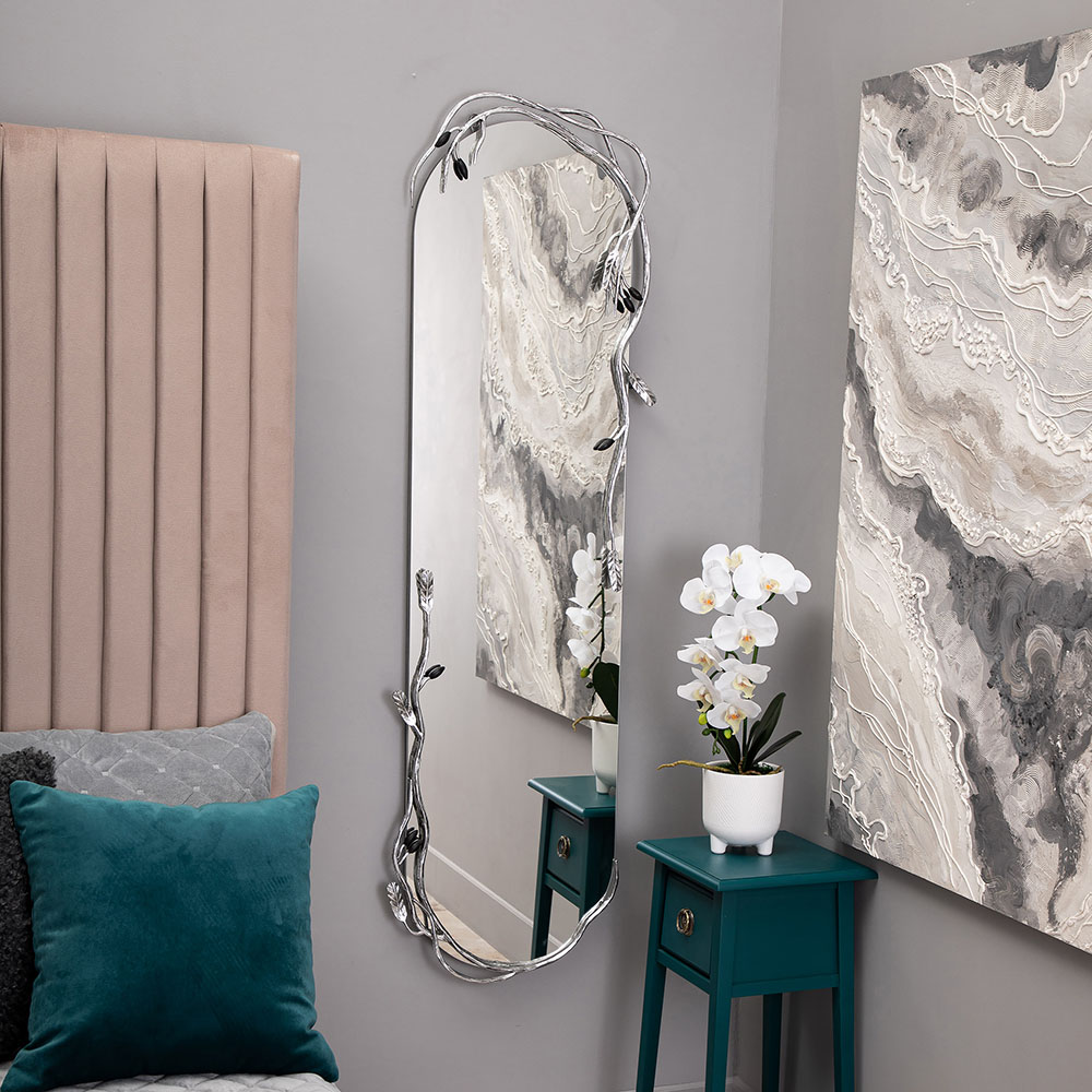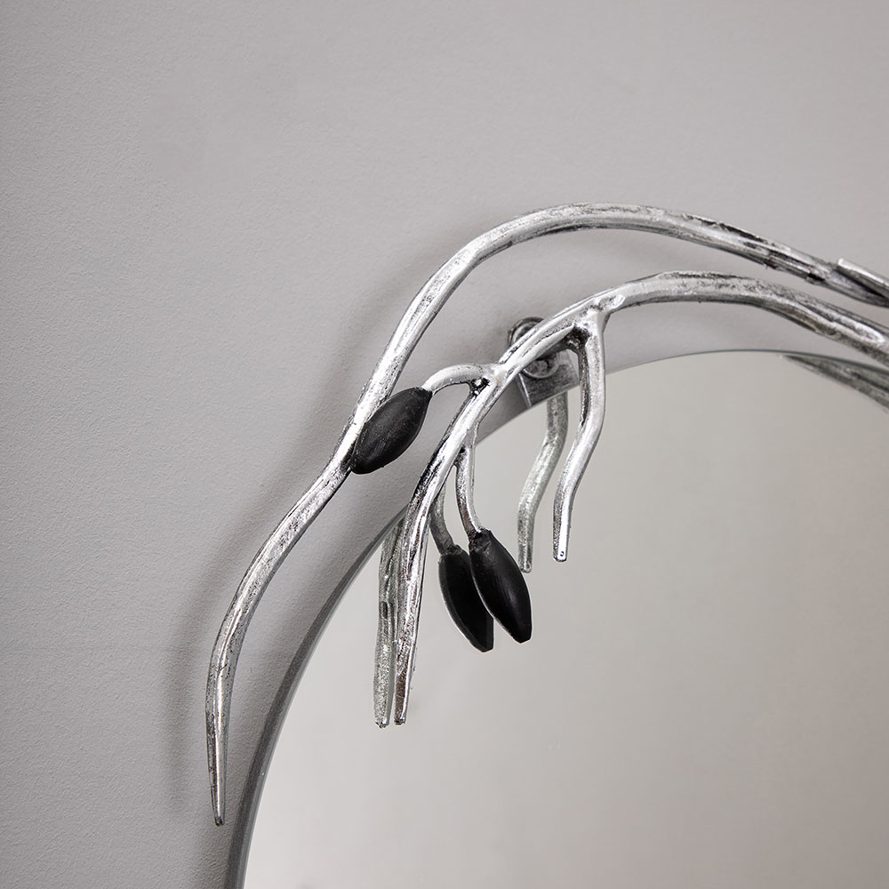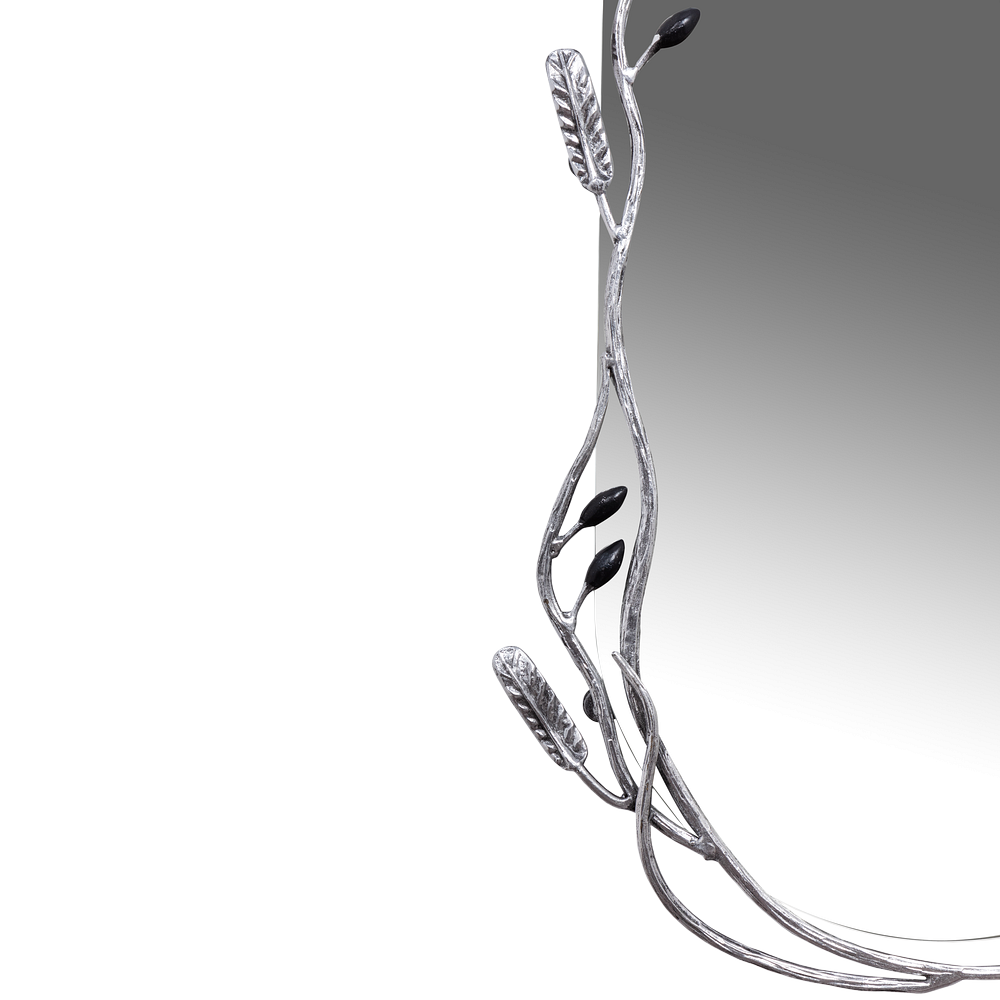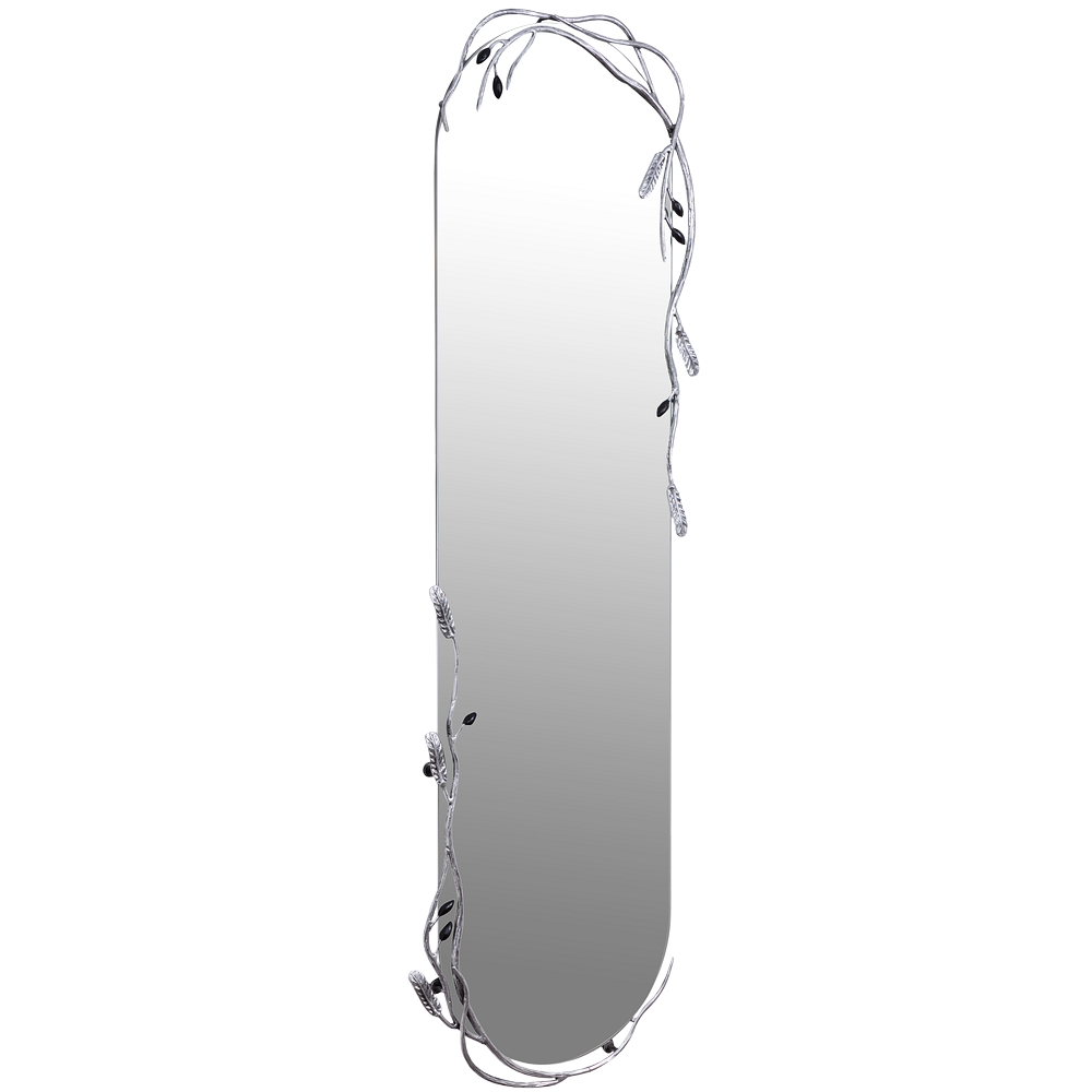 Увеличить пространство гардеробной, гостиной или холла легко вместе с интерьерными зеркалами BOGACHO.Зеркальное полотно закреплено на металлической раме из легированной стали. Декоративные элементы отлиты из натурального коелгинского мрамора, отшлифованы и патинированы вручную. Размер зеркального полотна: 141см х 38см.Интерьерное зеркало BOGACHO Oliva Branch Серебристого цвета (ручная работа) отлично подойдёт для пространства в эко-стиле, стиле Прованс или Арт-деко.Внесите завершающий штрих в свой интерьер вместе с эксклюзивными изделиями BOGACHO.