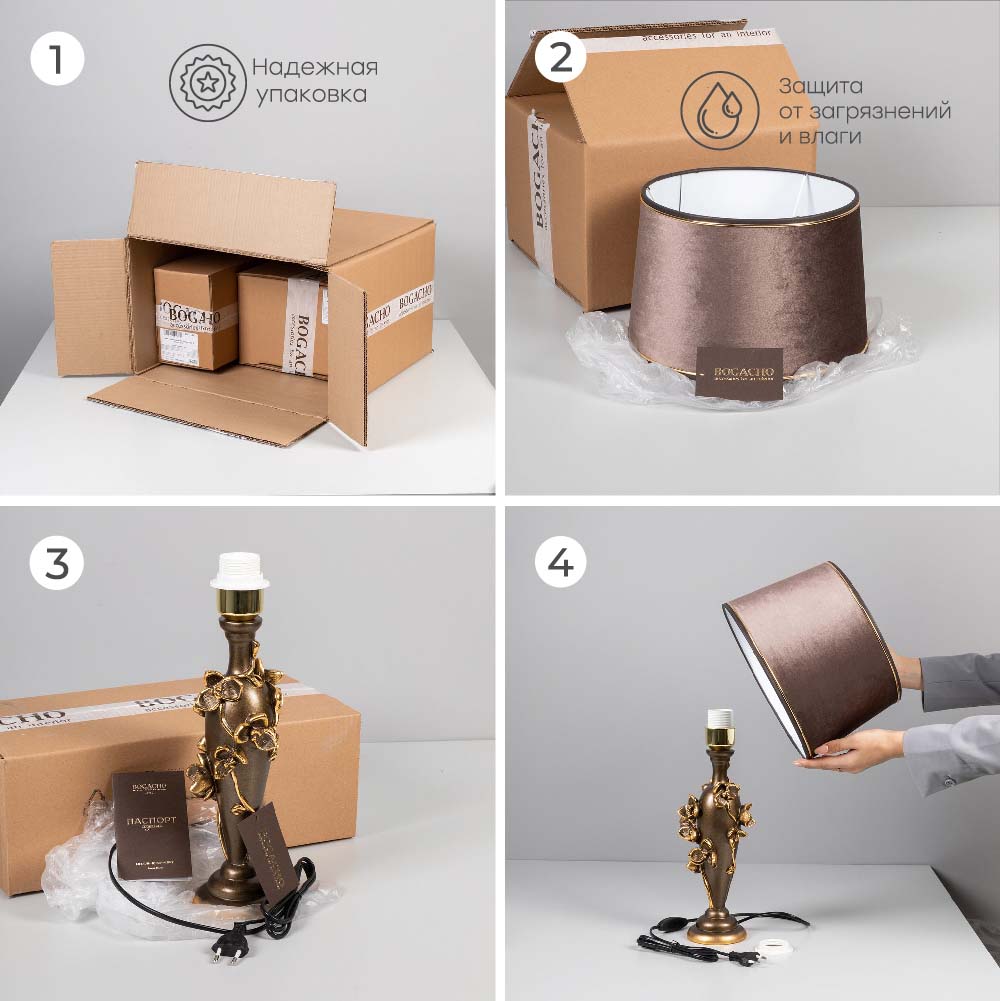 Может ли настольная лампа быть полноценным декором для гостиной и спальни? Да! Если это светильник настольный российской фабрики BOGACHO. Сможете ли вы назвать это произведение искусства обычным светильником? Едва ли! Благодаря выразительному дизайну светильник настольный декоративный впишется в любой интерьер и сделает уютным даже самый темный уголок вашего дома. Интерьерная настольная лампа, призвана наполнить интерьер мягкостью света, комфорта и создать гармонию и атмосферу уюта. Этот светильник с абажуром позволяет расширить возможность дизайнерского решения дома или комнаты. Основание светильника выполнено из литьевого мрамора, отшлифовано и патинировано вручную. Абажур с нижним способом крепления имеет металлический каркас с применением технологии порошковой покраски и креплением под цоколь Е27. Подключается в розетку питания 220в (напряжение) через провод.В зависимости от насыщенности и световой температуры лампочки, вы сможете задавать тон освещения под любое настроение, от рабочего белого дневного света до более теплого тона для отдыха, релакса, расслабления и романтики. Светильник очень практичен в использовании - легко собирается и устанавливается в лучших традициях ikea.Товар произведен в России и соответствует всем стандартам безопасности. При свете ночника удобно читать. Благодаря абажуру свет рассеивается равномерно по комнате, не режет глаза и не мешает никому засыпать если в комнате вы не одни. Прикроватная лампа отлично подойдет на тумбочку, в спальню или на туалетный столик. Украсит интерьер: разместите ночной светильник на комоде. Удачно будет смотрется на консольном столике в прихожей. Можно ипользовать светильник ночник для гостиниц. Он украсит интерьер и станет незаменимой деталью для полной комплектации как квартир, так и номеров отелей. Для защиты стола от царапин, мы установили накладки из мягкой ткани, препятствующие истиранию поверхности. Светильник завернут в воздушно - пузырчатую пленку, ложемент и надежно упакован в коробку из гофрированного картона, поэтому данный аксессуар для интерьера приедет к вам не поврежденным. Любите, чтобы интерьер был в едином стиле? Присмотритесь к продукции BOGACHO, которая будет гармонично сочетаться друг с другом. Лампа в комплект не входит.