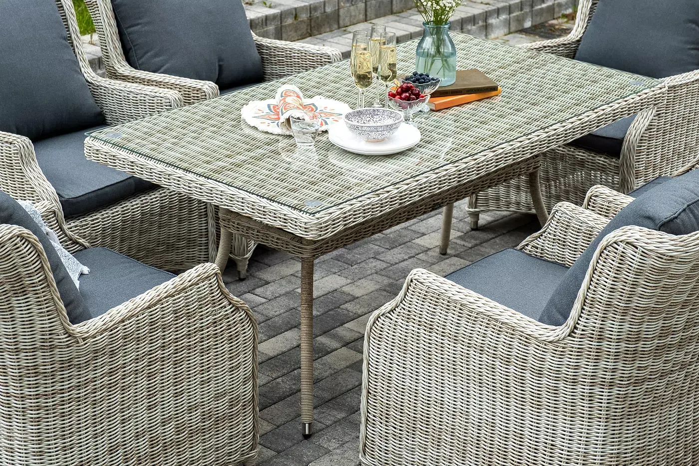Столешница укомплектована ударопрочным стеклом, толщиной 5 мм. Данное стекло крепится к столу при помощи четырех вакуумных силиконовых присосок и поставляется в собранном виде. Плетеные стулья для удобства использования оснащены подлокотниками и подушками серого цвета на спинках и сидениях. Ткань обработана влагоотталкивающей пропиткой.