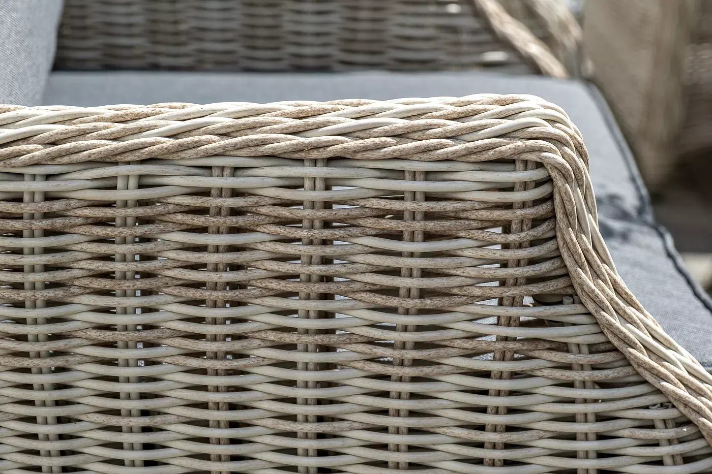 Каркас всех изделий выполнен из легкого и долговечного алюминия, оплетенного вручную круглым искусственным ротангом натурального бежевом цвета.