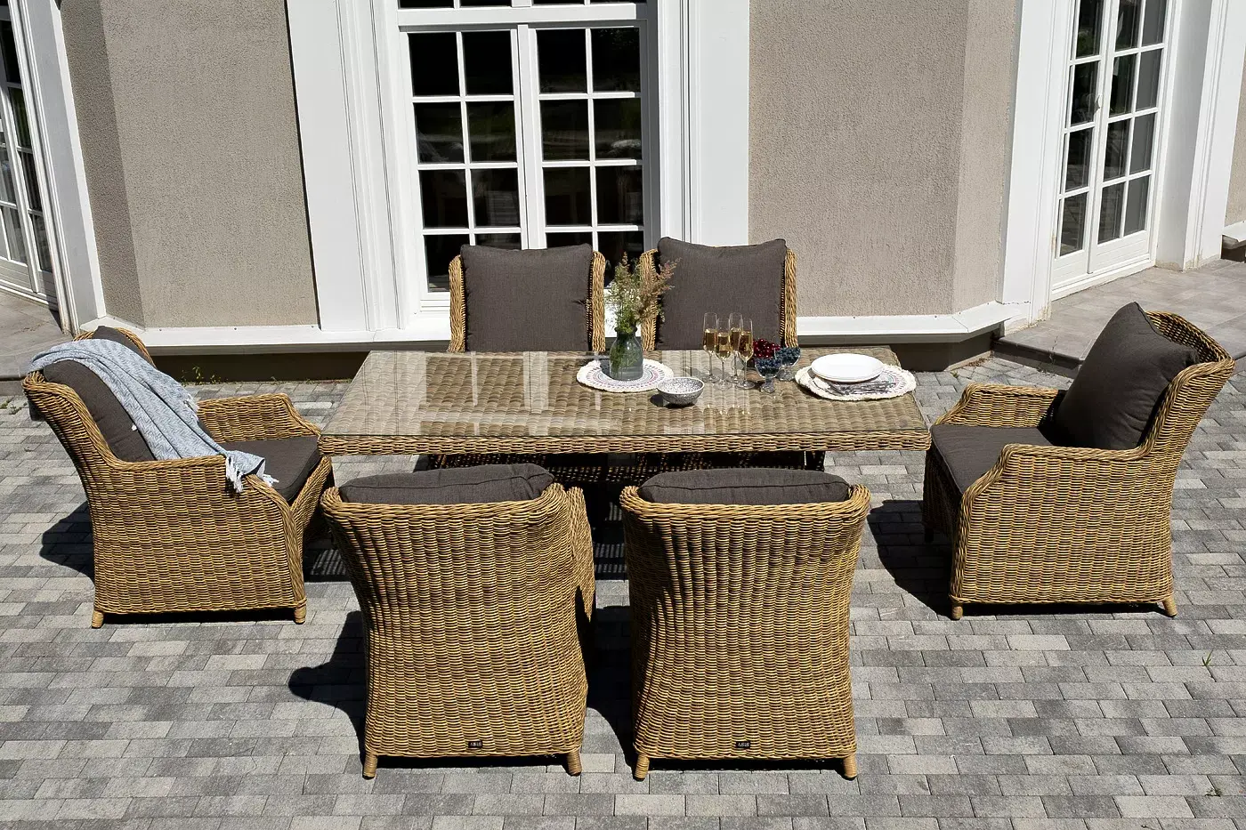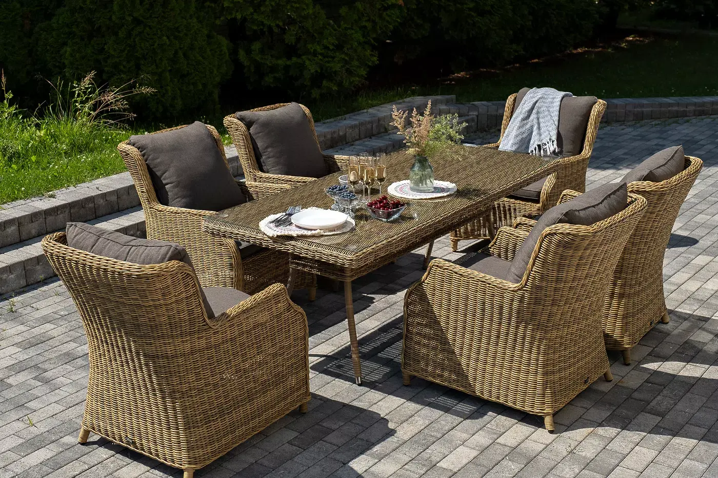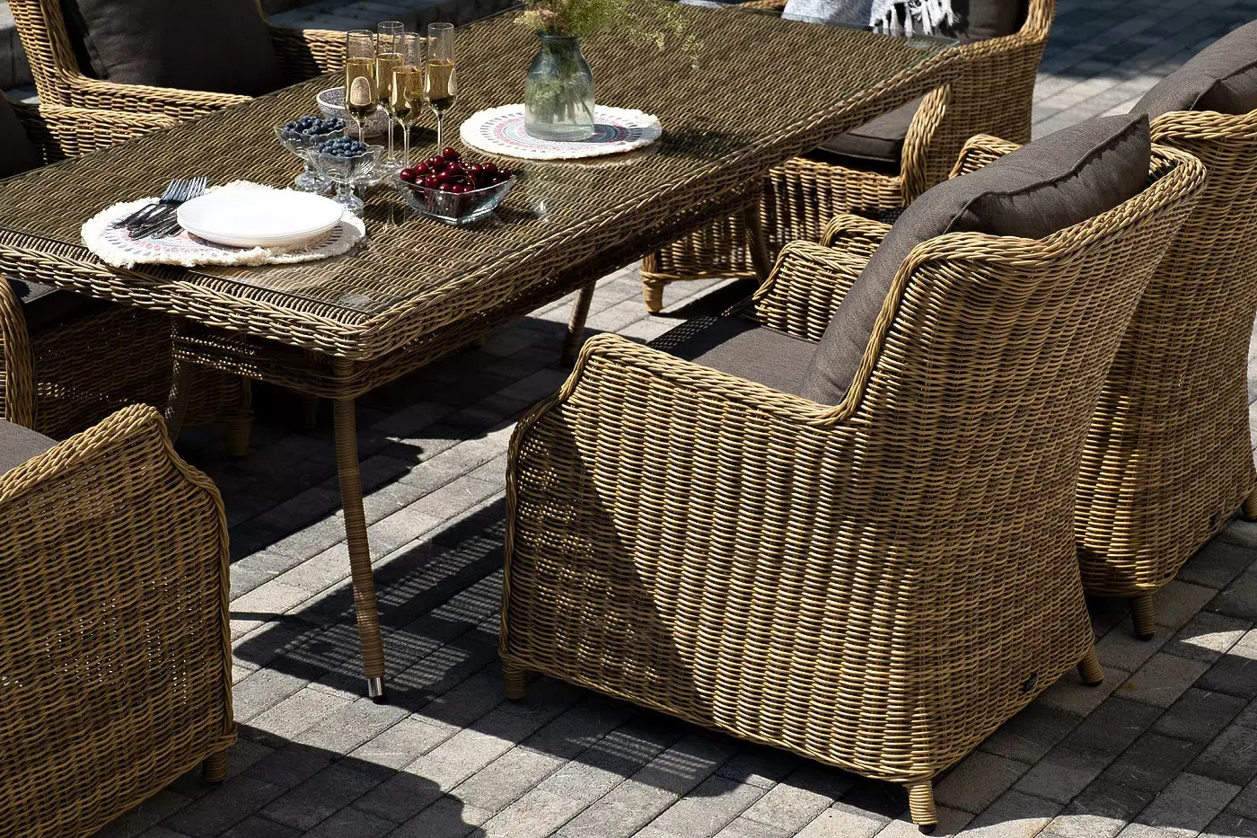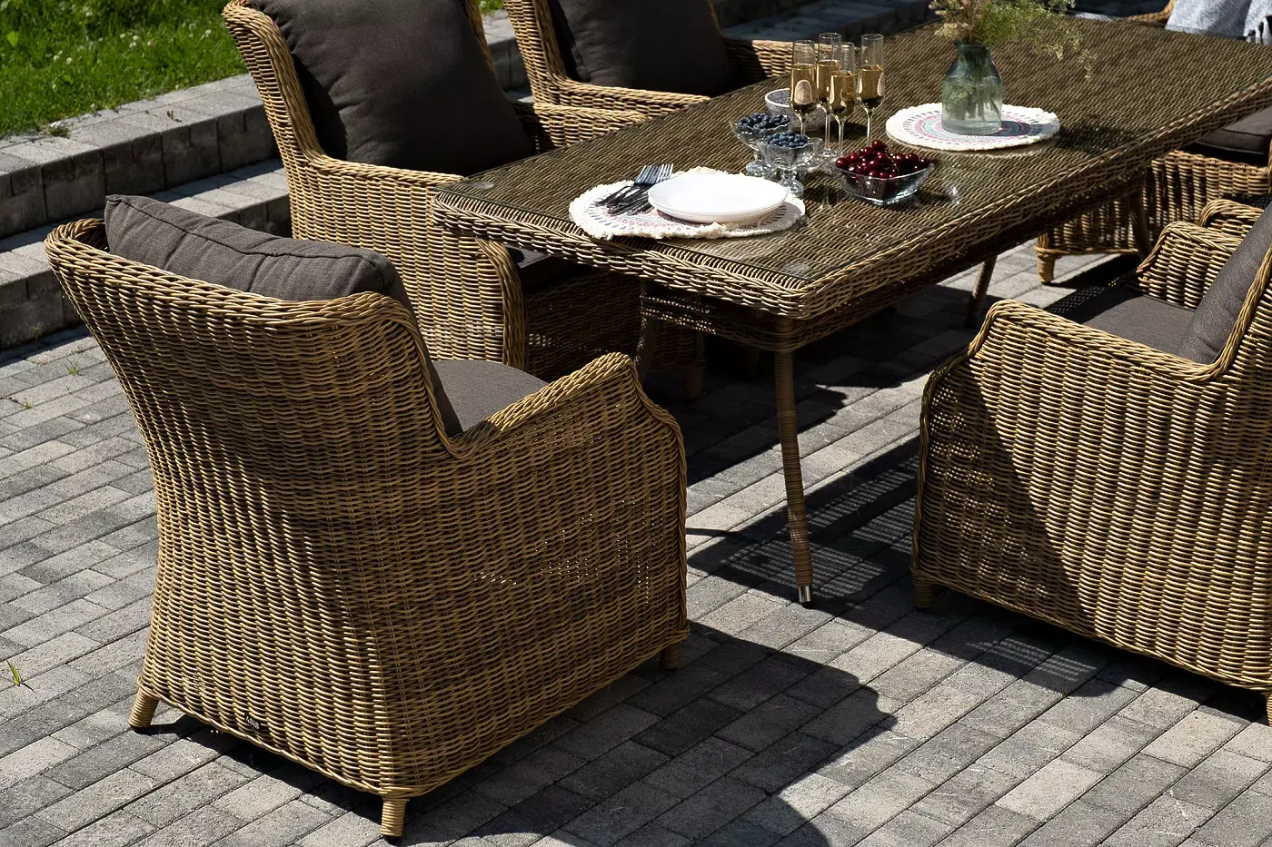 Столешница укомплектована ударопрочным стеклом, толщиной 5 мм. Данное стекло крепится к столу при помощи четырех вакуумных силиконовых присосок и поставляется в собранном виде. Плетеные стулья для удобства использования оснащены подлокотниками и подушками серого цвета на спинках и сидениях. Ткань обработана влагоотталкивающей пропиткой.