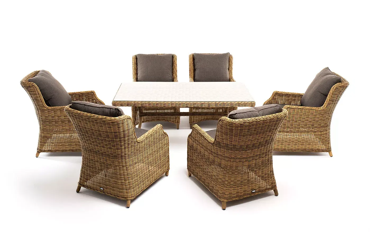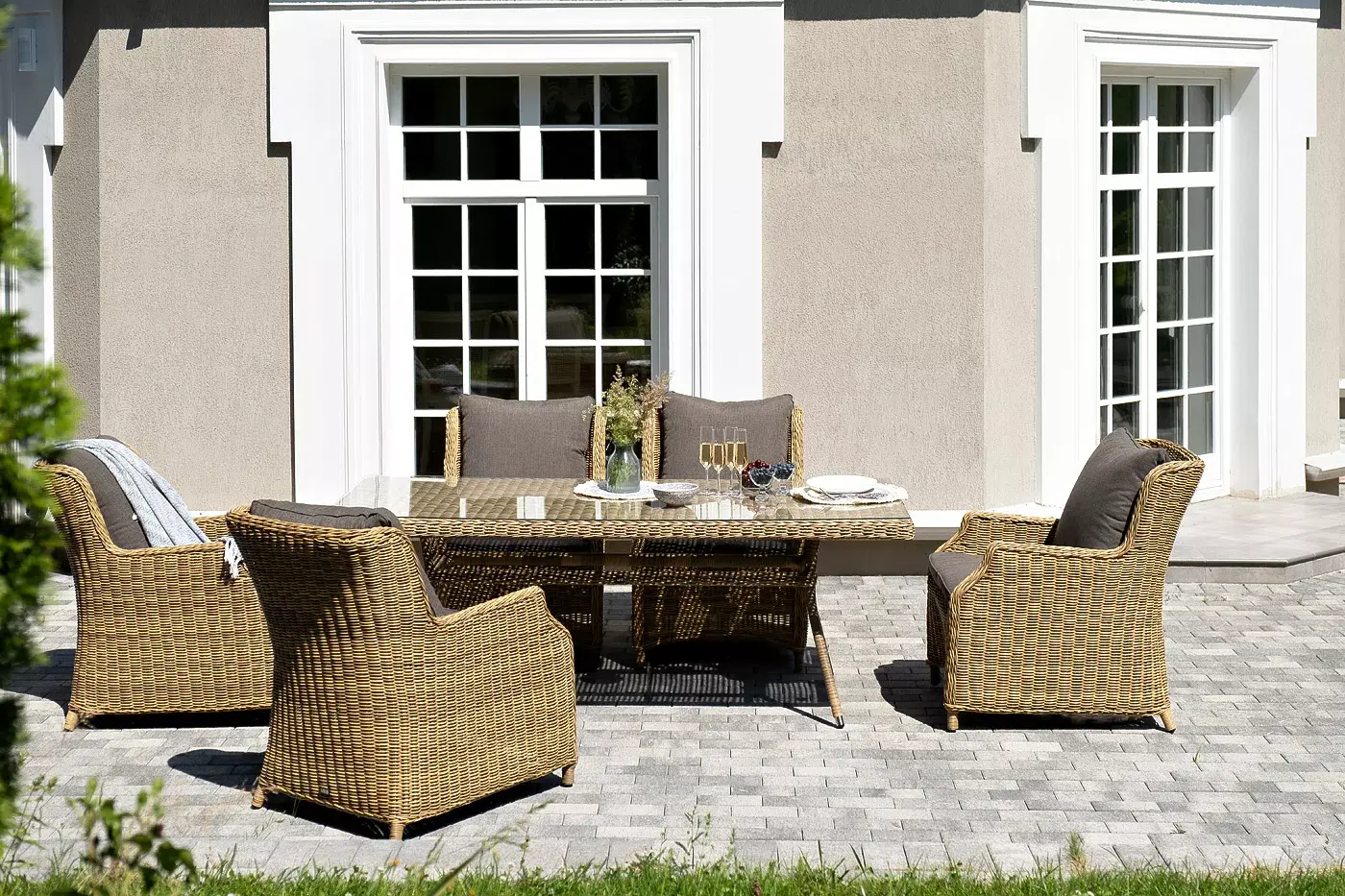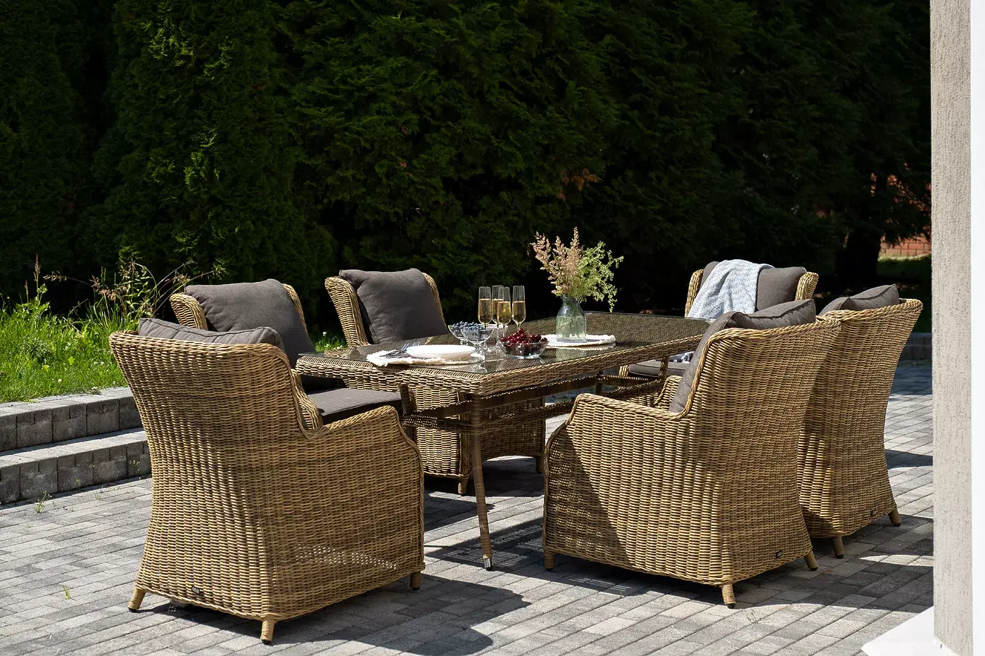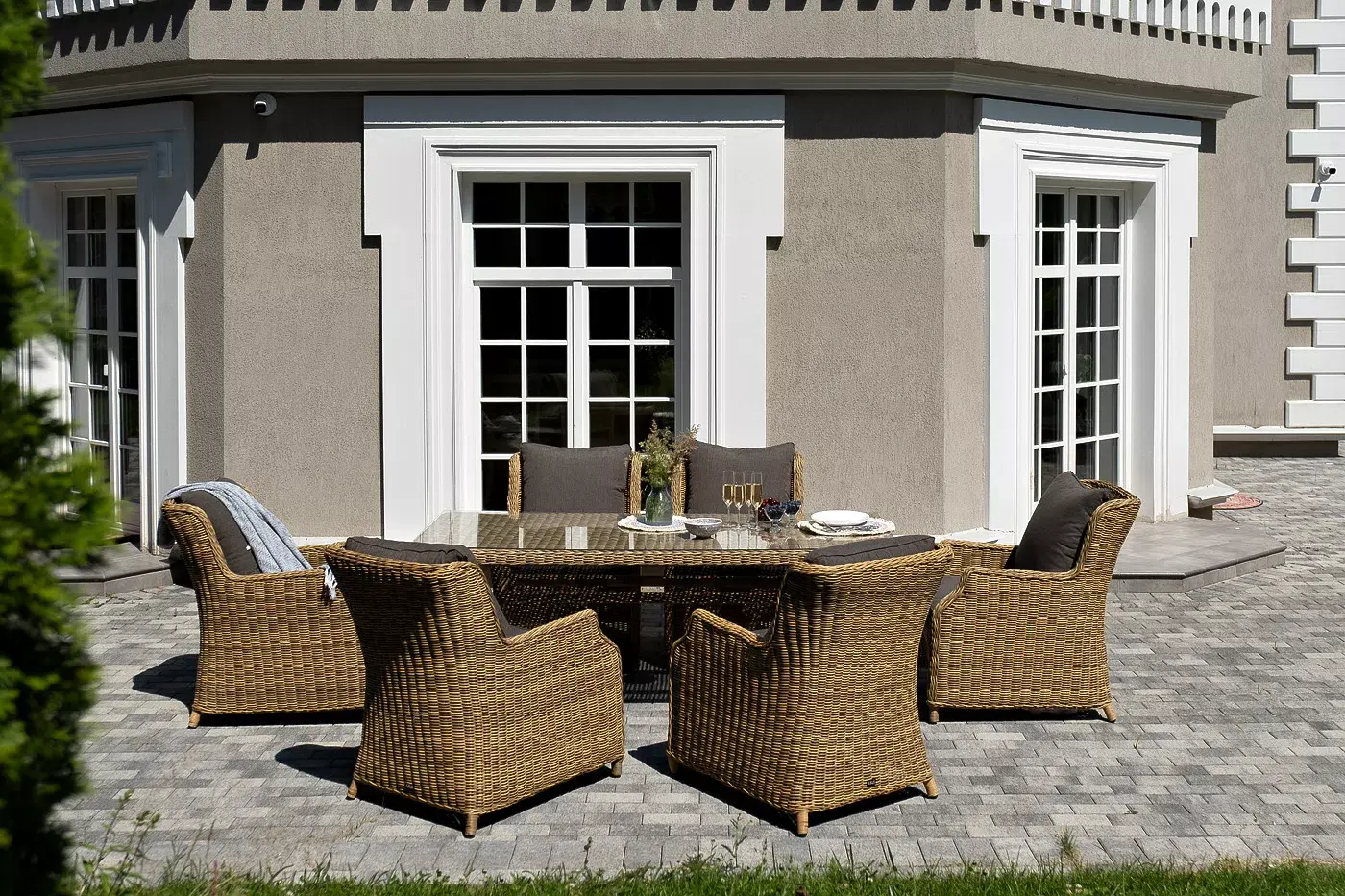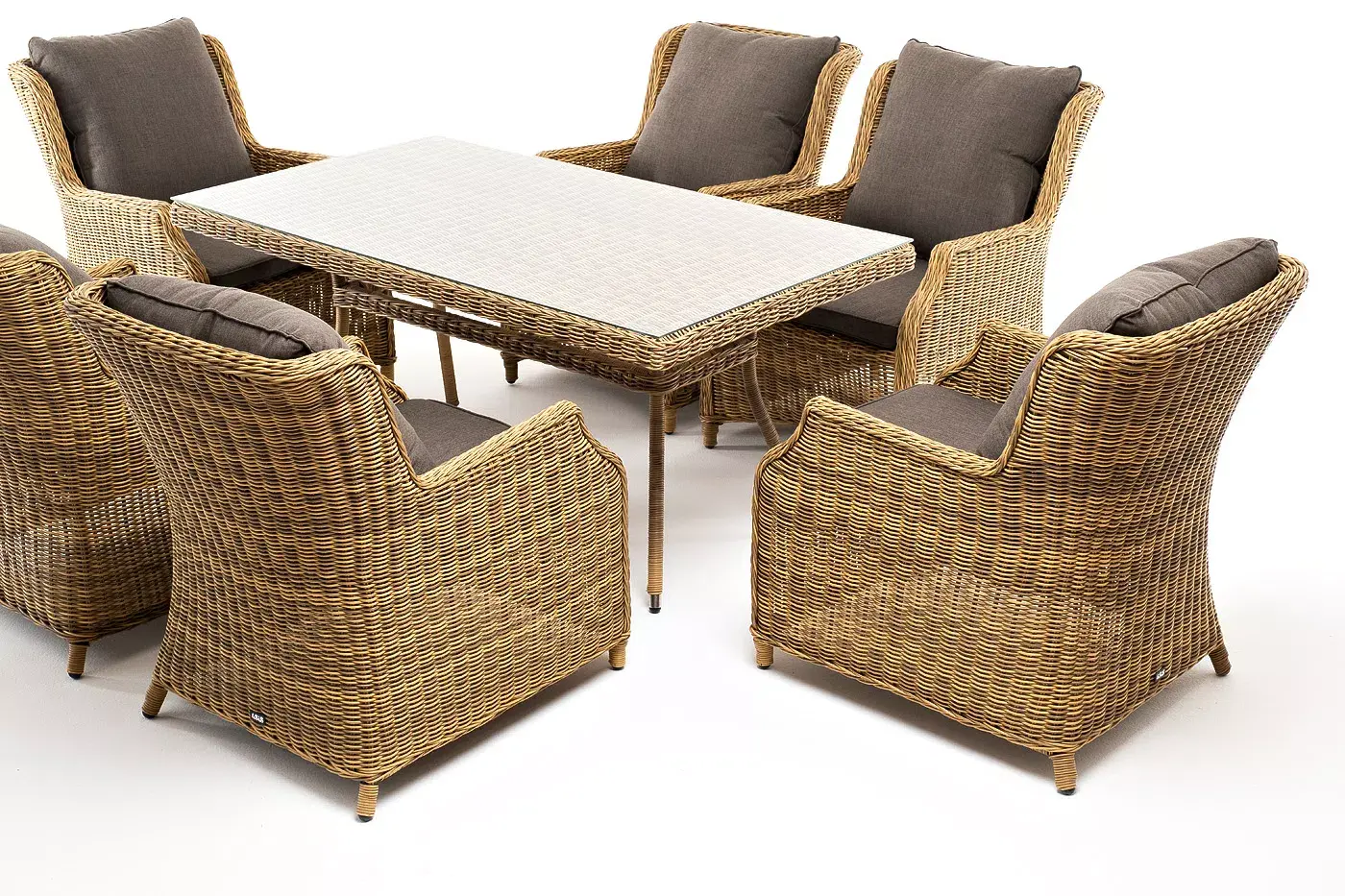 Столешница укомплектована ударопрочным стеклом, толщиной 5 мм. Данное стекло крепится к столу при помощи четырех вакуумных силиконовых присосок и поставляется в собранном виде. Плетеные стулья для удобства использования оснащены подлокотниками и подушками серого цвета на спинках и сидениях. Ткань обработана влагоотталкивающей пропиткой.