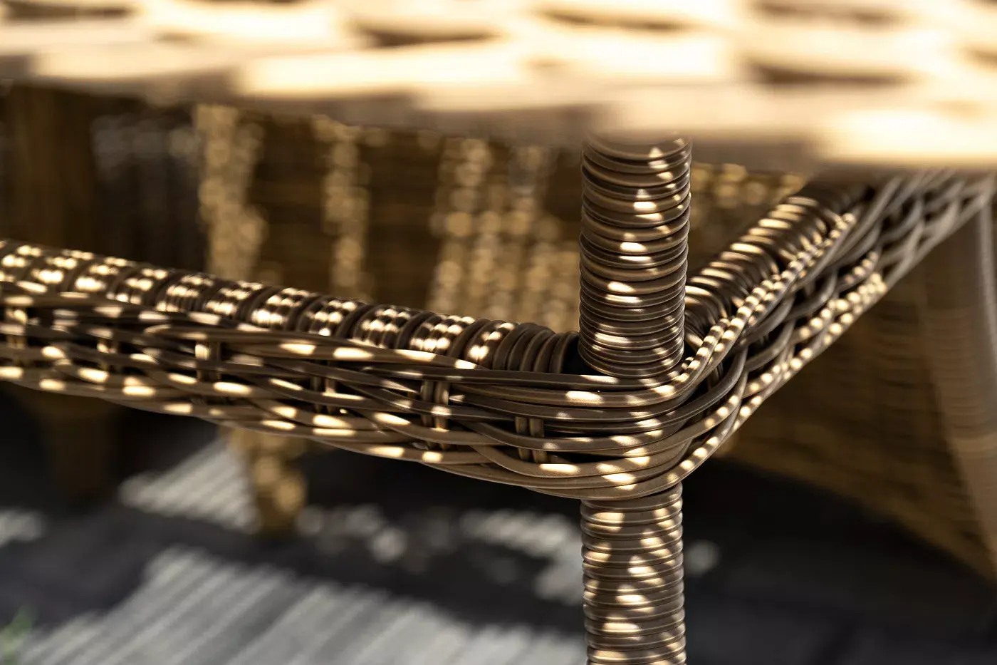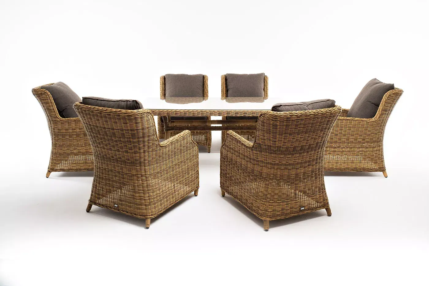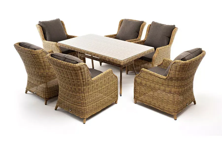 Каркас всех изделий выполнен из легкого и долговечного алюминия, оплетенного вручную круглым искусственным ротангом натурального соломенного цвета.