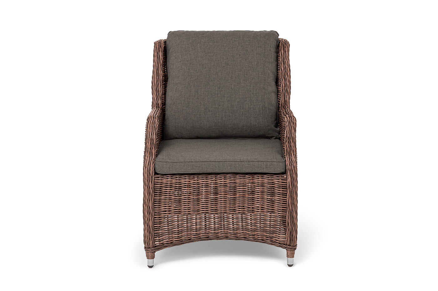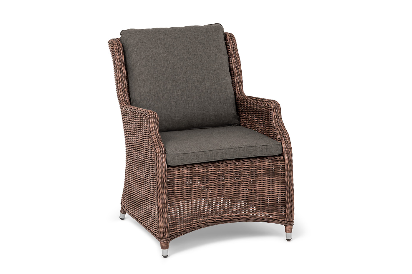 Спинка и подлокотники имеют планые линии, благодаря своим закругленным формам. Каркас мебели сделан из алюминия. Присутствует ручное круглое плетение, при изготовлении которого используется искусственный ротанг. Представлено в коричневом цвете.