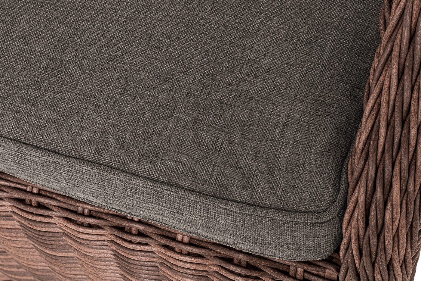 Плетенный стул дополняют мягкие подушки. Они выполнены в сером оттенке. Пошиты изделия из плотного полиэстера 300гр/м2. Ткань предварительно обрабатывается влагоотталкивающей пропиткой.