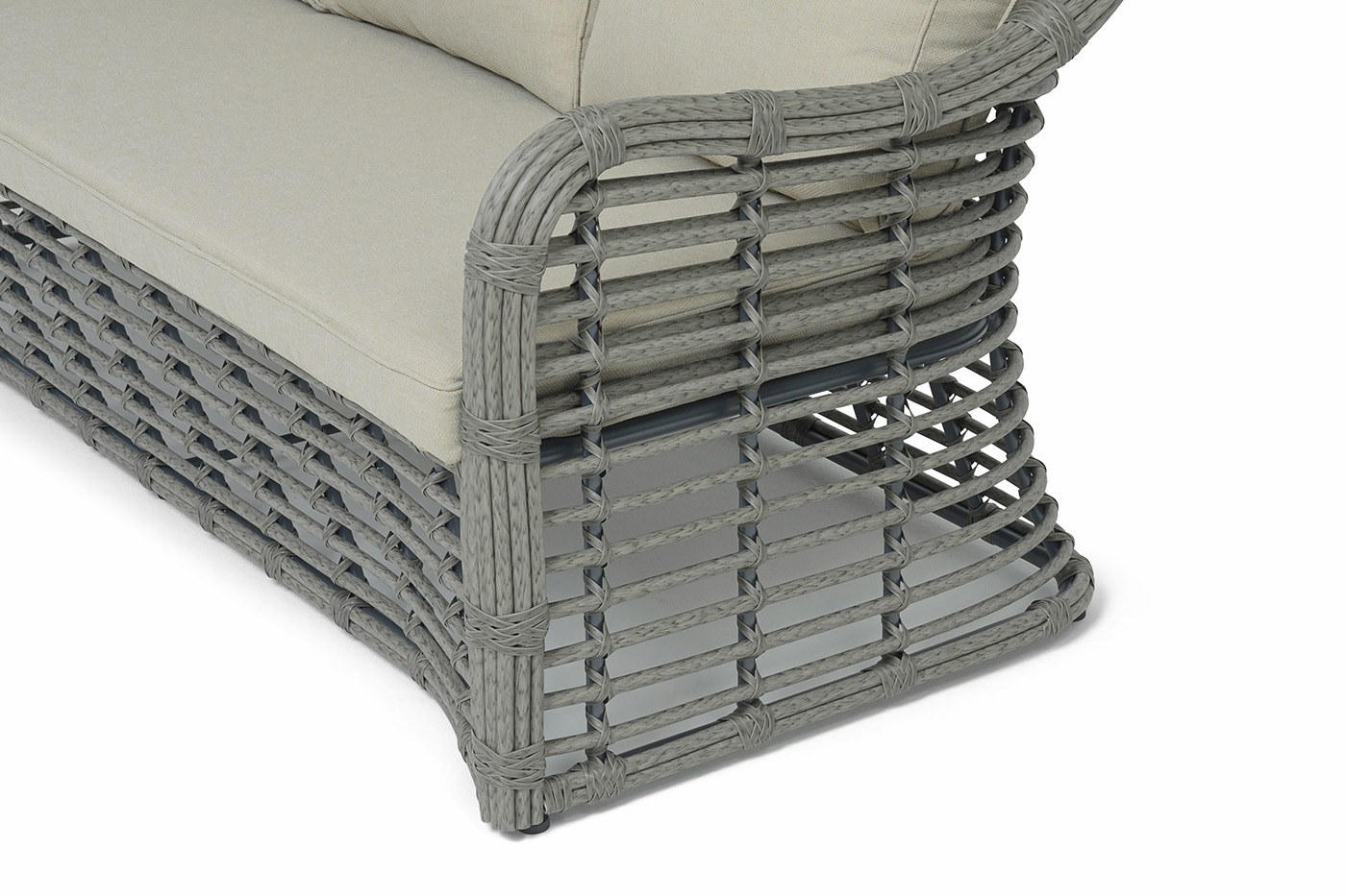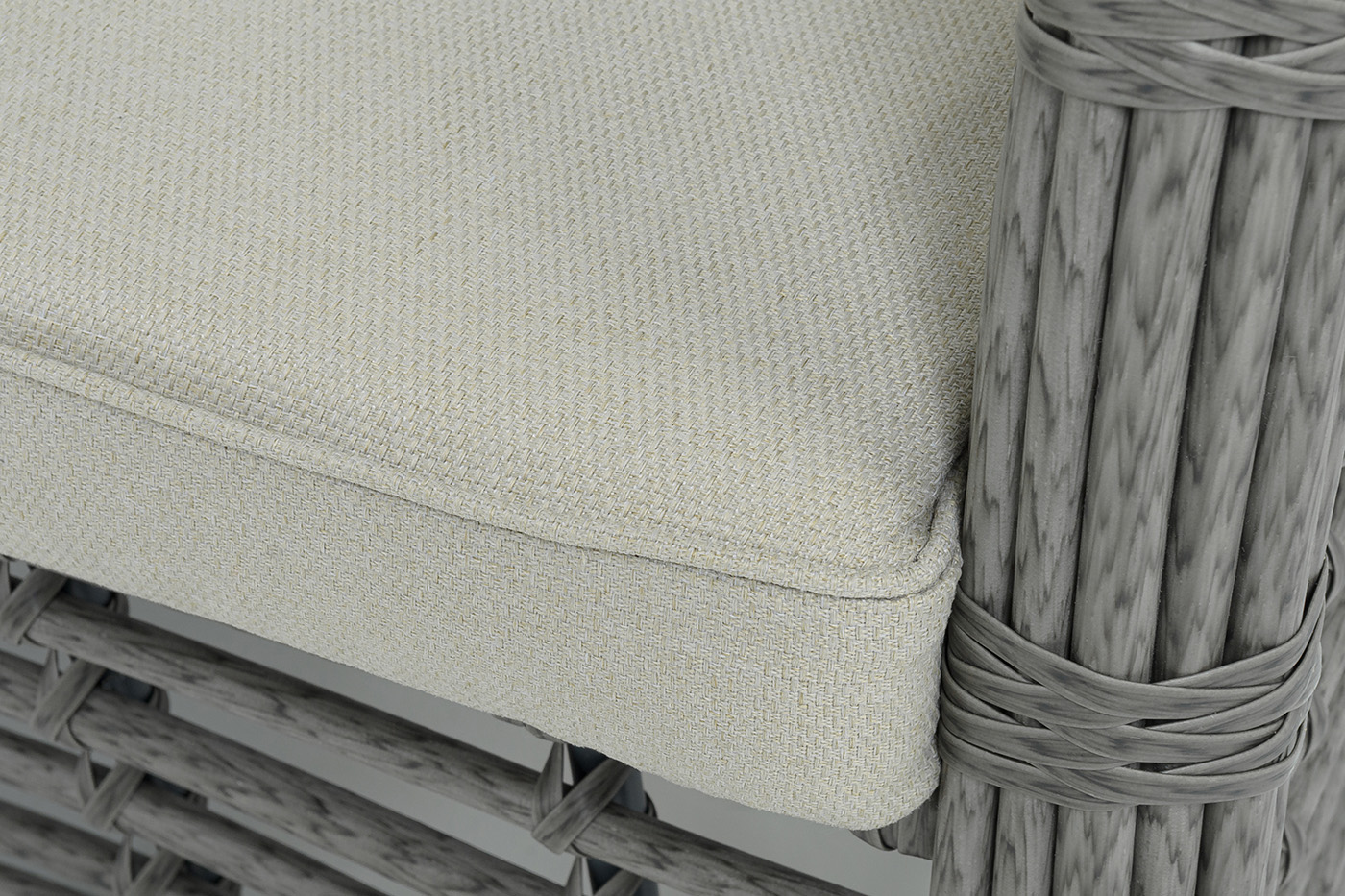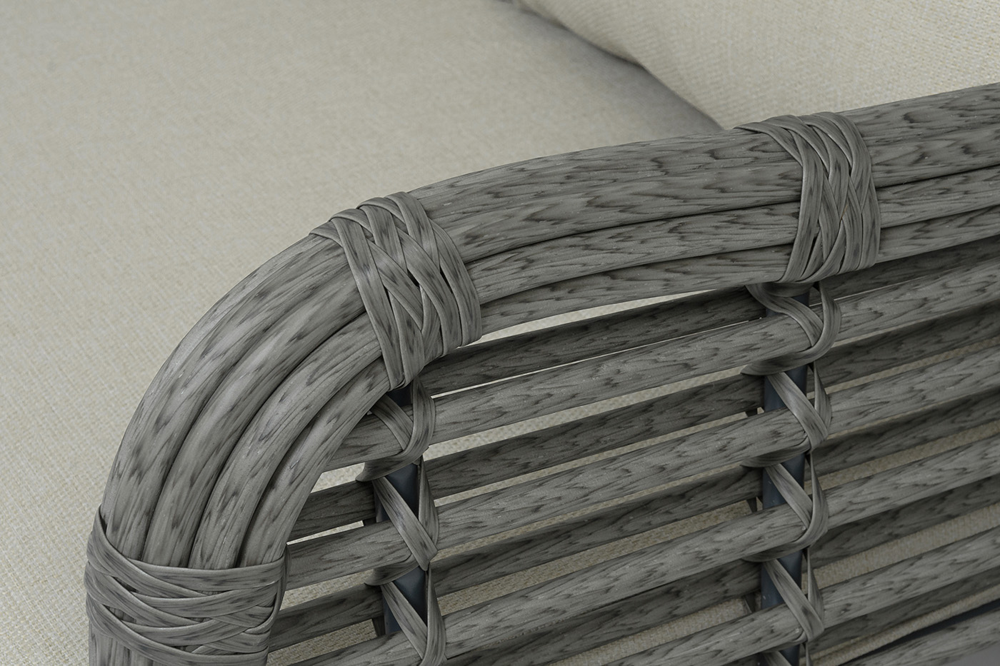 Ручное круглое плетение является основным декоративным элементом мебели. Оно выполнено из искусственного ротанга в сером цвете.