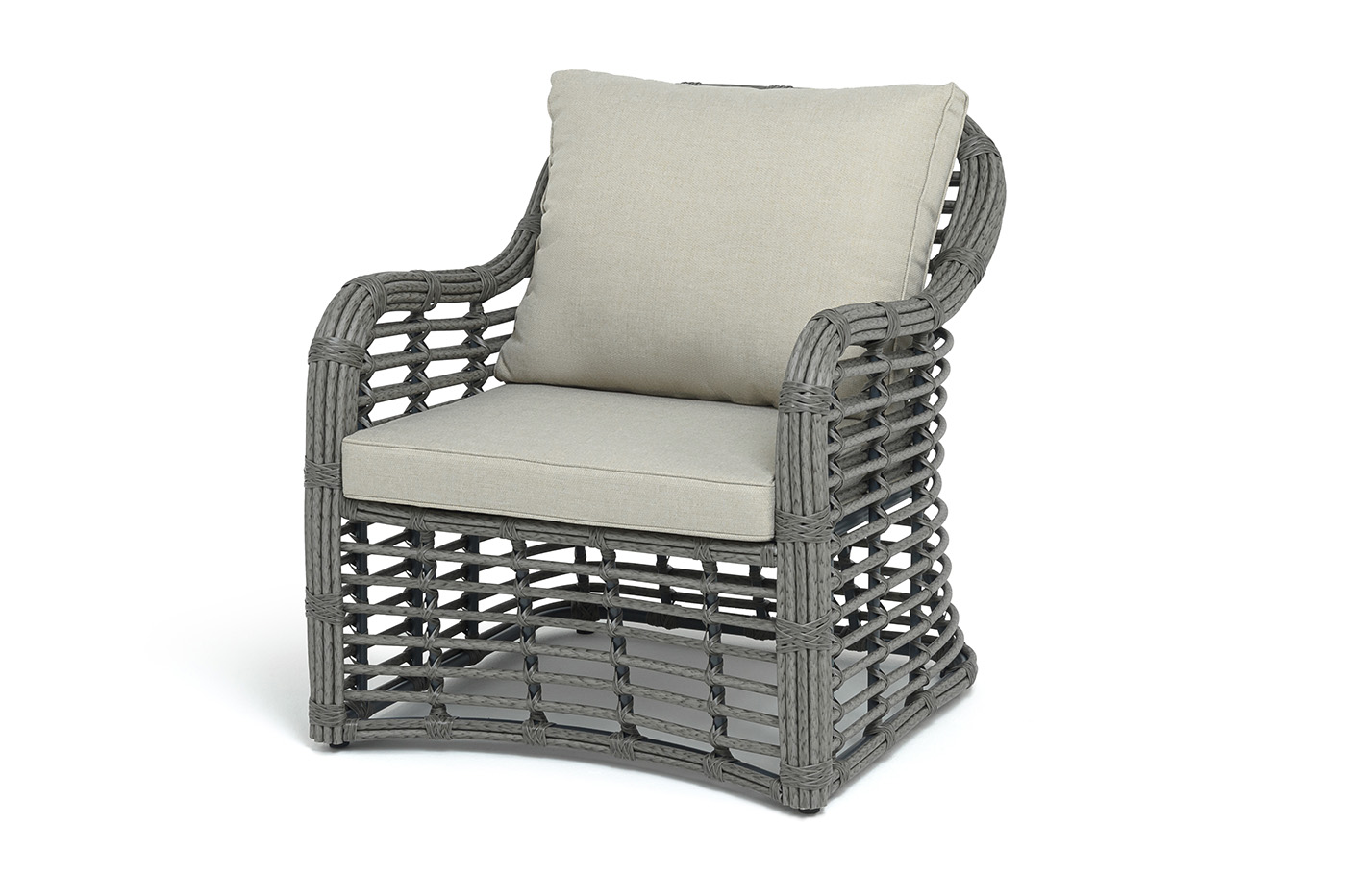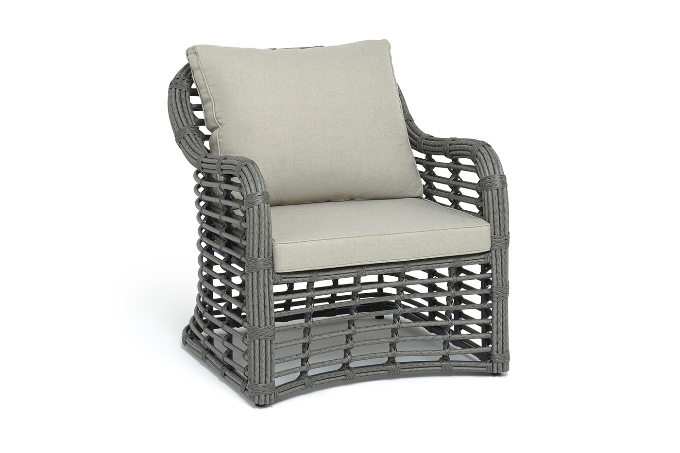 Каркас мебели сделан из прочного алюминия с высокими эксплуатационными качествами. Оплетен вручную с помощью круглого искусственного ротанга. Представлено в сером оттенке.