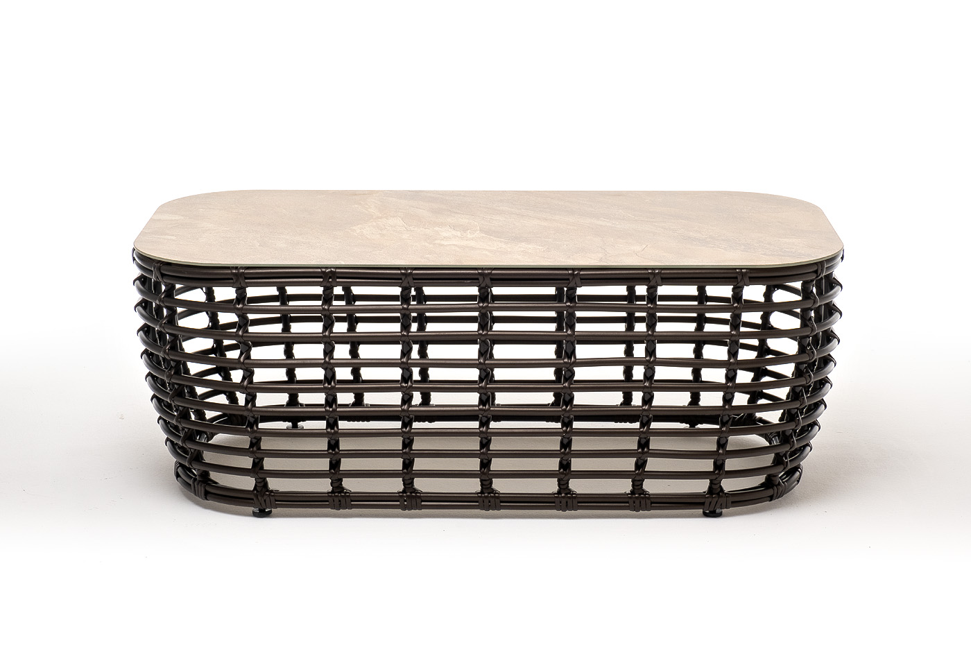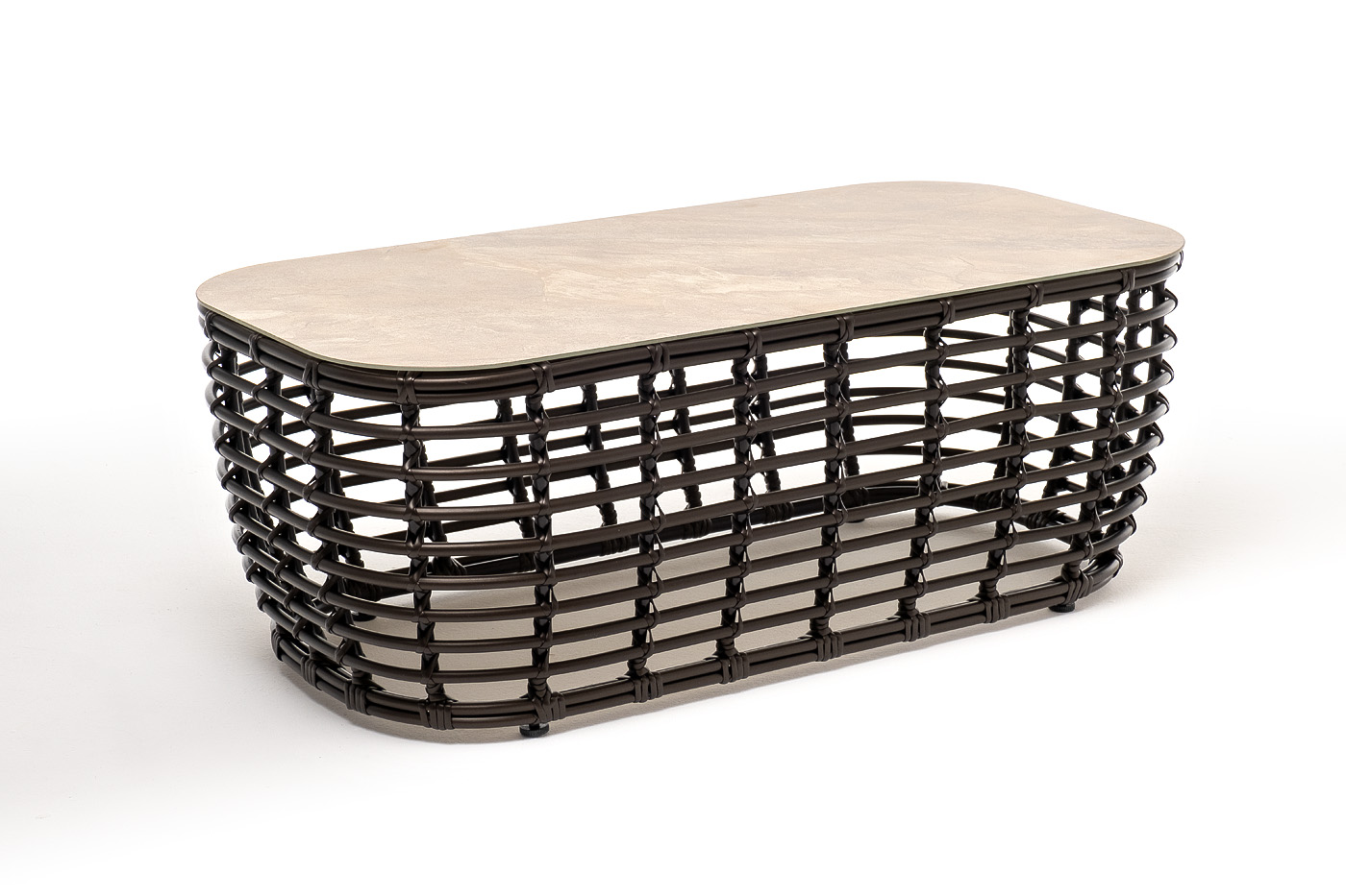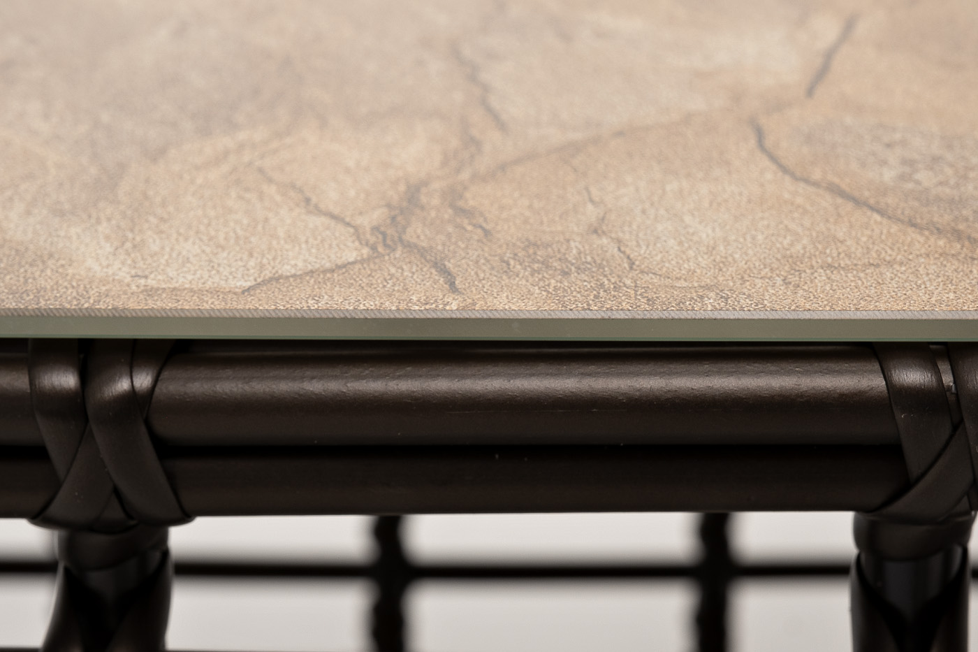 Каркас столика изготовлен из алюминия, вручную оплетенного круглым искусственным ротангом.