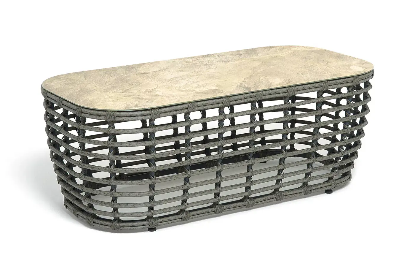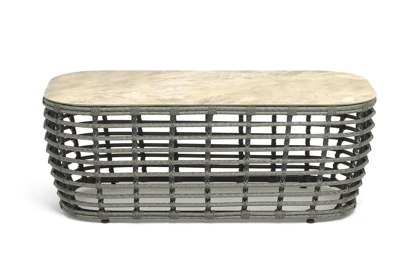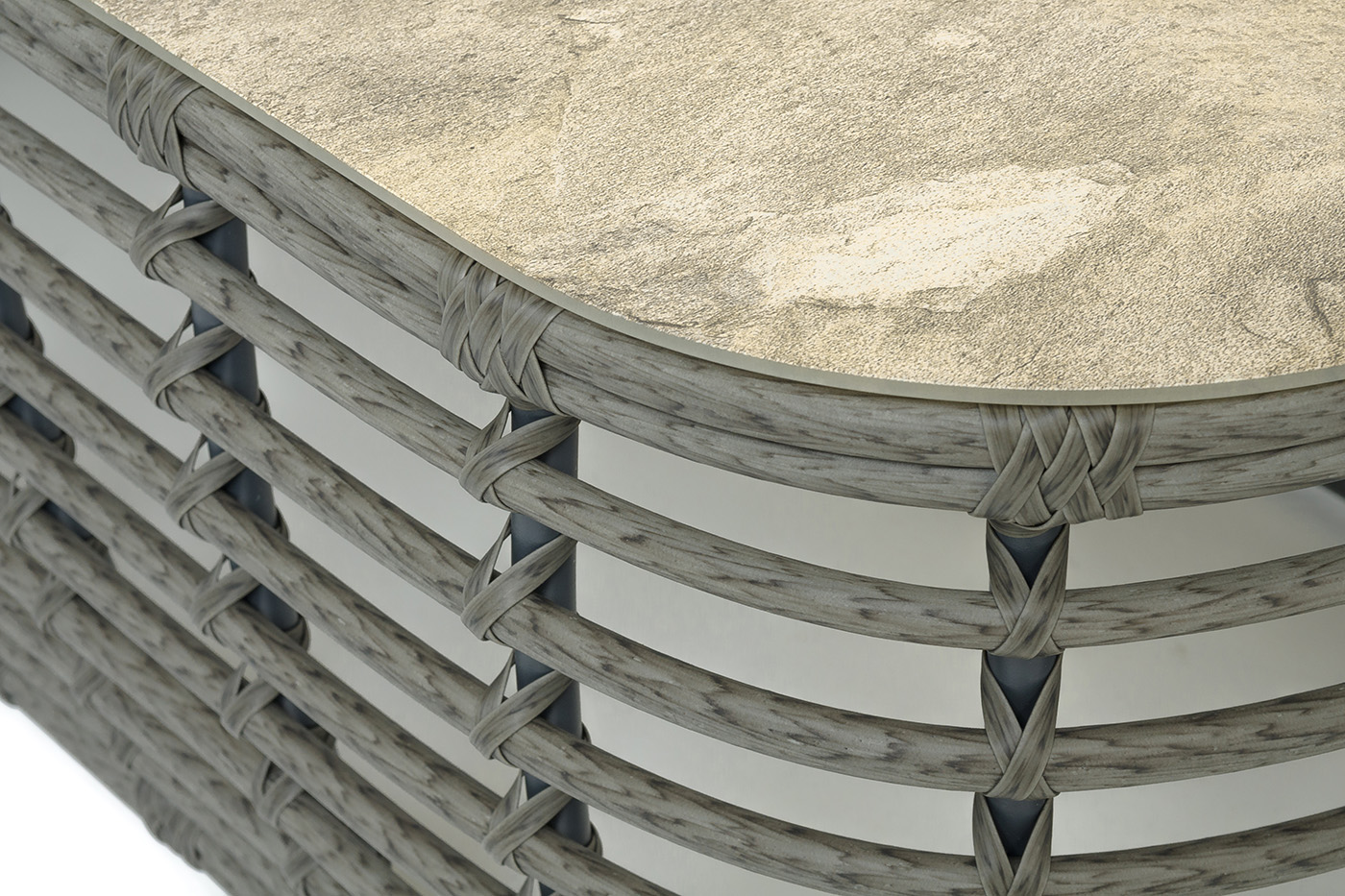 Каркас столика изготовлен из алюминия, вручную оплетенного круглым искусственным ротангом.