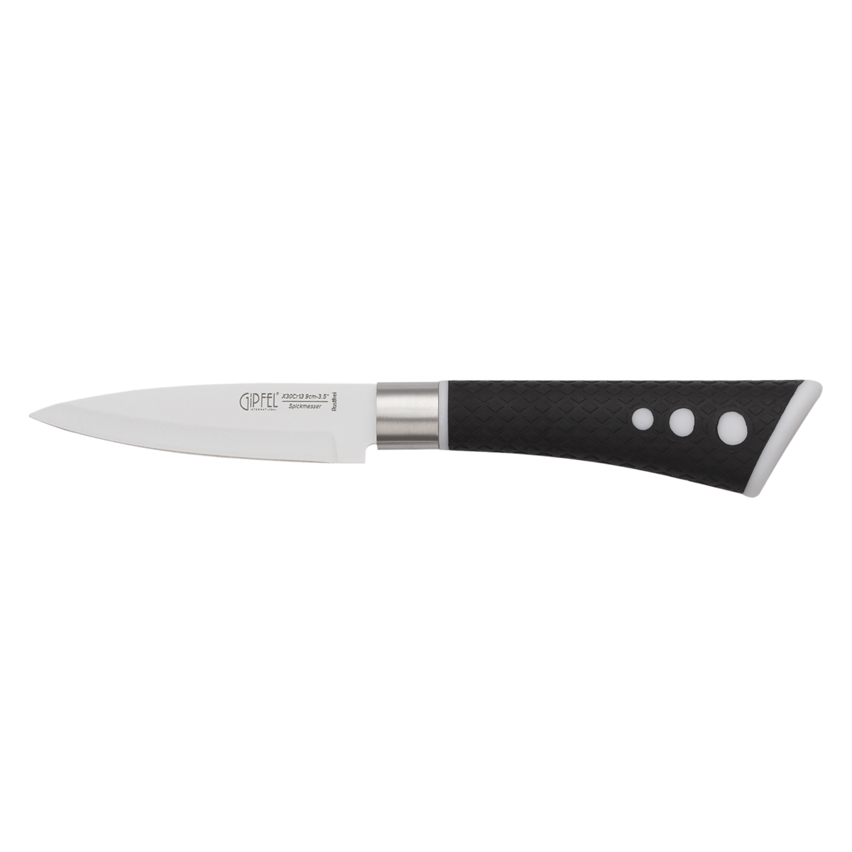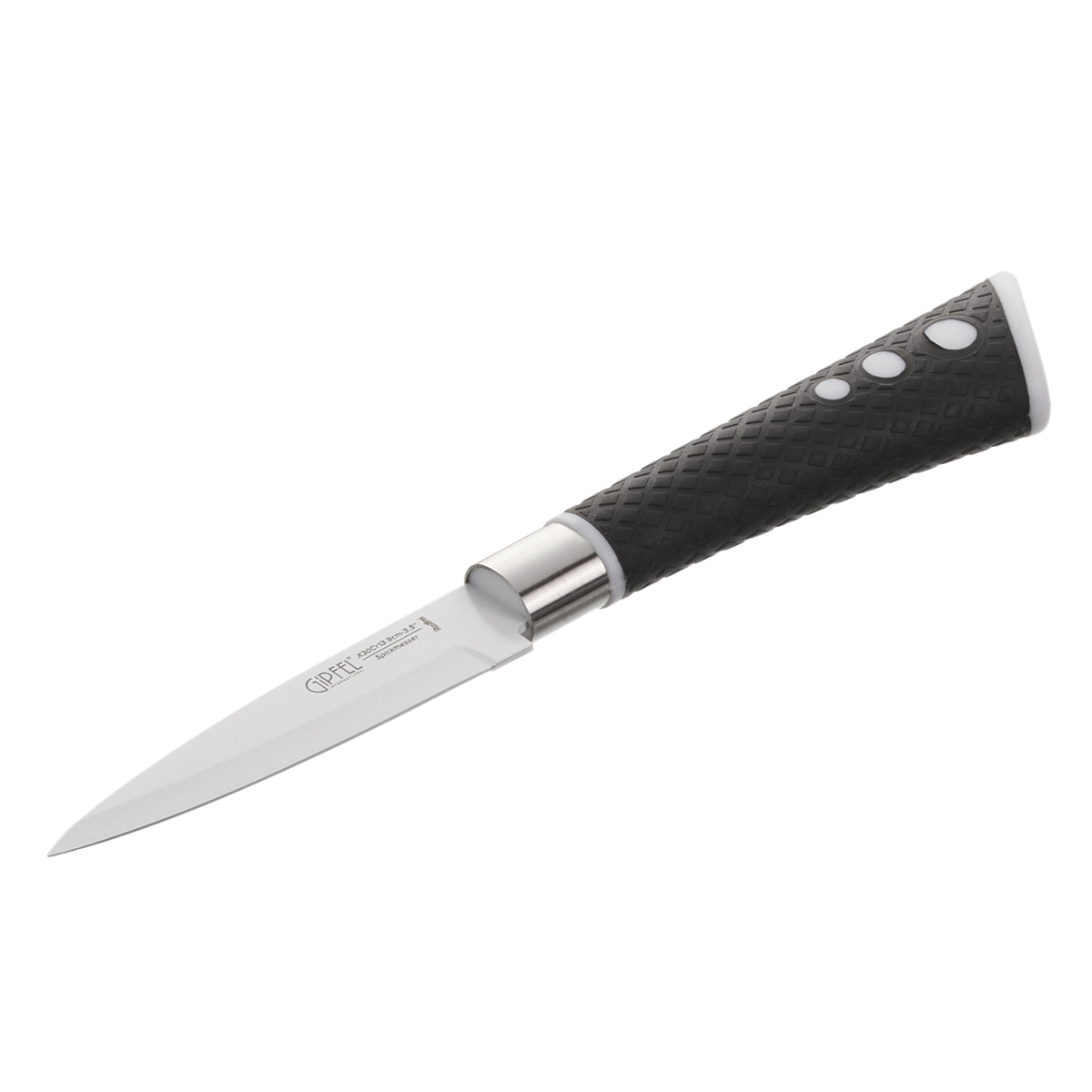 Нож для чистки овощей Gipfel 8478. Длина лезвия 9 см. Материал лезвия: нержавеющая сталь 3CR13 с антиприлипающим покрытием. Материал ручки: пластик soft touch. Цвет лезвия: белый. Цвет ручки: черный.