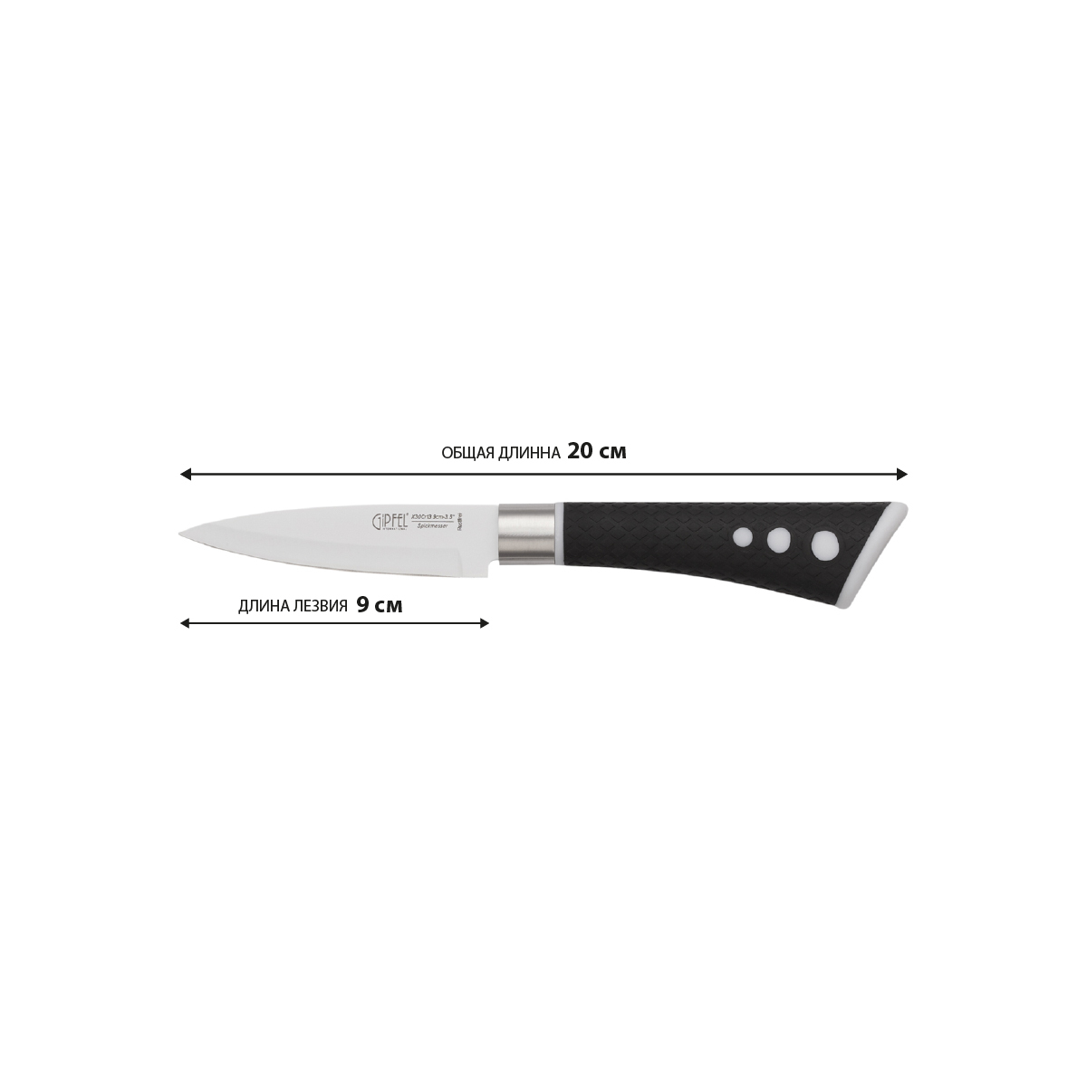 Нож для чистки овощей GIPFEL 8478. Длина лезвия 9см. Материал лезвия: нержавеющая сталь 3CR13 с антиприлипающим покрытием. Материал ручки: пластик soft touch. Цвет лезвия: белый. Цвет ручки: черный.