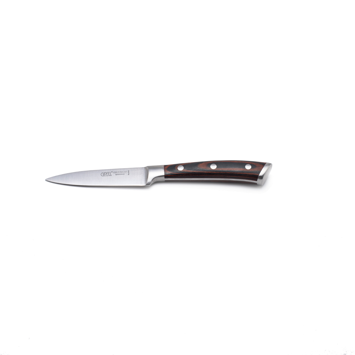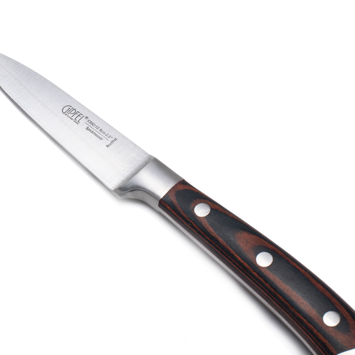 Нож для овощей Gipfel Laffi 8431. Длина лезвия 9 см, толщина клинка 2 мм. Лезвие ножа выполнено из нержавеющей стали 3Cr13 с лазерной гравировкой. Рукоять из нержавеющая сталь SS430 и износостойкого пластика высокого класса Pakka wood.