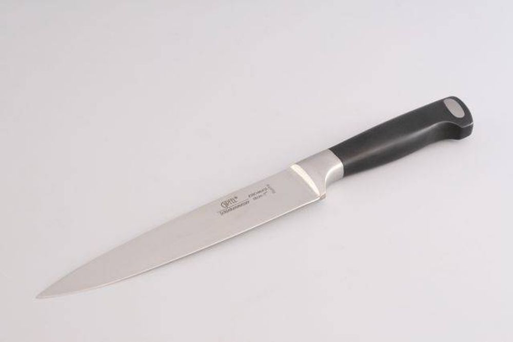 Серия ножей PROFESSIONAL LINE неспроста получила свое название – качество данных ножей делает их выбором профессиональных поваров. Ножи PROFESSIONAL LINE отличаются от других, прежде всего, материалом лезвия, которым является сталь марки X50CrMoV15. Она является отличным сочетанием остроты, гибкости и прочности, то есть именно тем, чем и должен выделяться идеальный кухонный нож. Добавьте к этому удобную бакелитовую рукоятку, которая не выскальзывает при резке, и вы получите настоящие профессиональные ножи, которыми теперь можно укомплектовать и вашу кухню! Длина данного шинковочного ножа составляет 17 см.