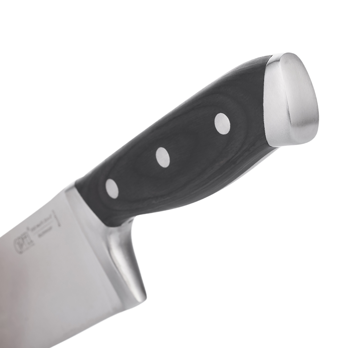 Нож поварской GIPFEL AMBASSADOR 50442. Лезвие длиной 20 см. Длина ножа 34 см, ширина лезвия 5 см. Материал лезвия: сталь X50CrMoV15. Материал ручки: сталь, древеснослоистый пластик. Толщина лезвия 2,5 мм.