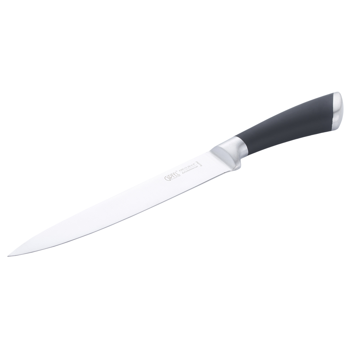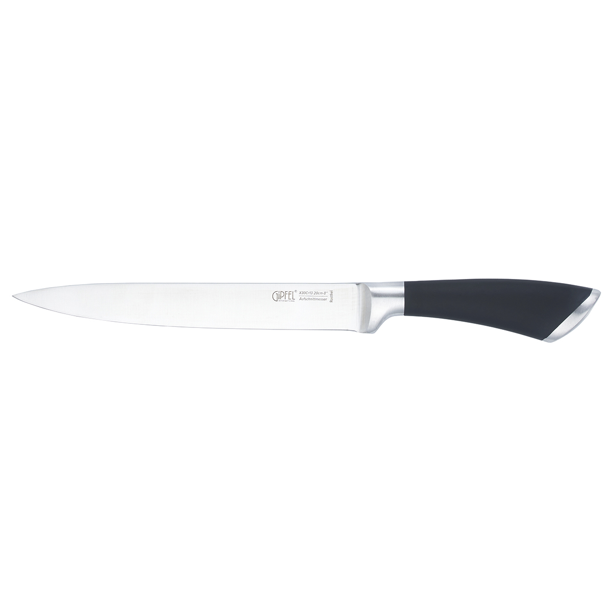 Нож разделочный GIPFEL TURINO 51011 20см. Лезвие сделано из стали X30CR13. Рукоятка сварная, выполнена из стали 430 и термопластичной резины. Толщина лезвия 2,3мм. У ножа двусторонняя заточка, угол с каждой стороны 15°.