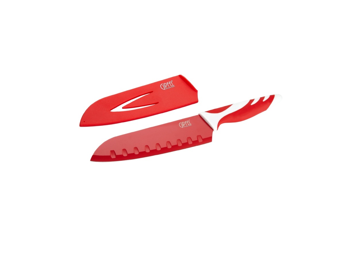 Нож сантоку GIPFEL Rainbow 6784. Размер 18 см. В комплекте пластиковый чехол. Ручка и чехол сделаны из пластика красного цвета. Лезвие из нержавеющей стали 3Cr13.