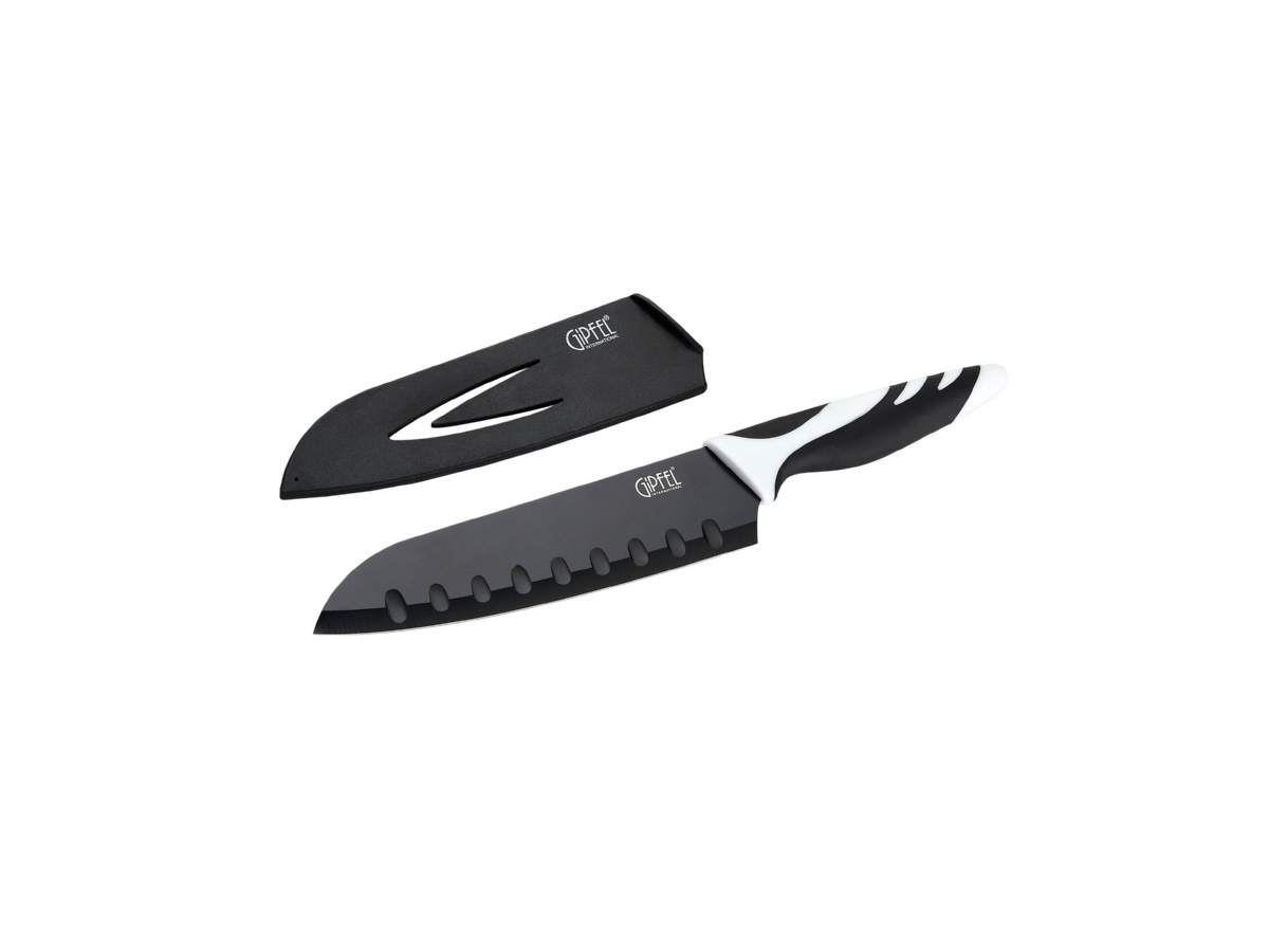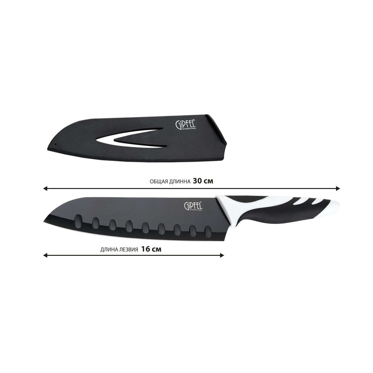 Нож сантоку GIPFEL Rainbow 6785. Размер 18 см. В комплекте пластиковый чехол. Ручка и чехол сделаны из пластика черного цвета. Лезвие из нержавеющей стали 3Cr13.