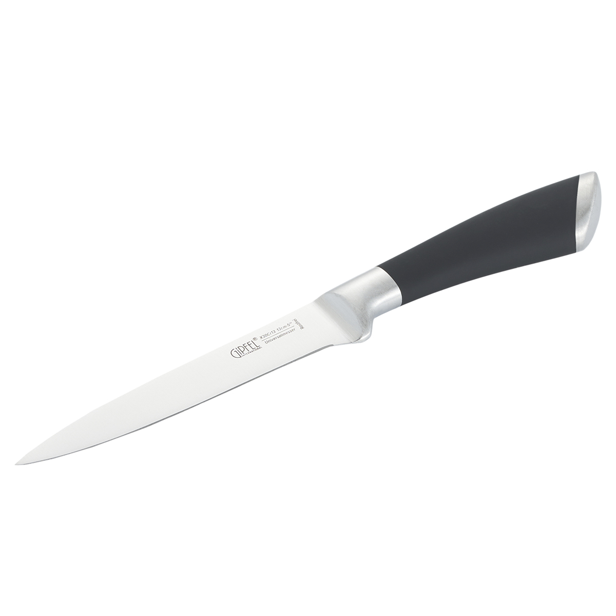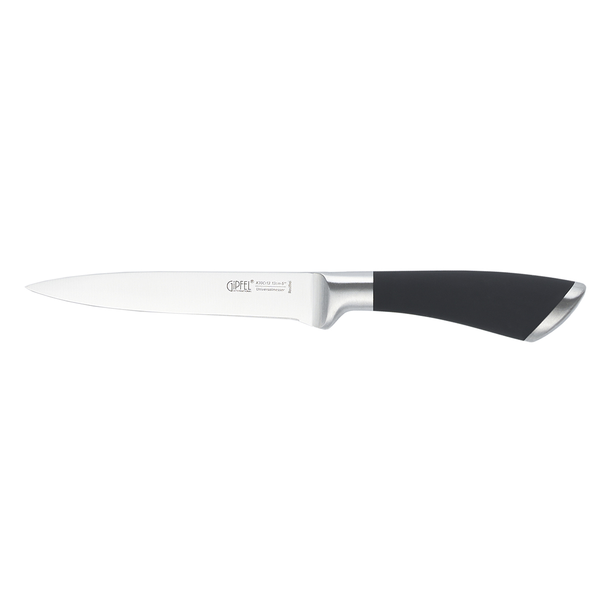 Нож универсальный GIPFEL TURINO 51013 13см. Лезвие сделано из стали X30CR13. Рукоятка сварная, выполнена из стали 430 и термопластичной резины. Толщина лезвия 1,8мм. У ножа двусторонняя заточка, угол с каждой стороны 15°.