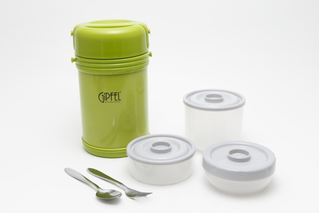- термос с двойными стенками- объём 2000 мл- нержавеющая сталь- 3 контейнера для первого блюда, второго бдюда, для салатов- вилка и ложка- упакован в фирменную коробку