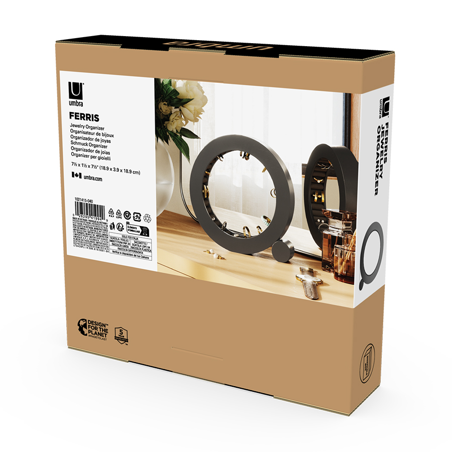 Органайзер для украшений Ferris понравится ценителям предметов из натуральных материалов и необычного декора. Выполненный в форме кольца из каучукового дерева, он будет оригинально смотреться на тумбе или туалетном столике. Внутренняя поверхность органайзера имеет бархатное покрытие, которое обеспечивает удобное и безопасное хранение украшений.