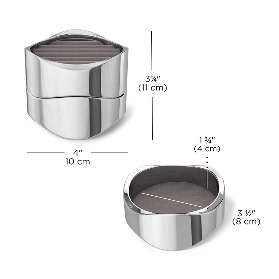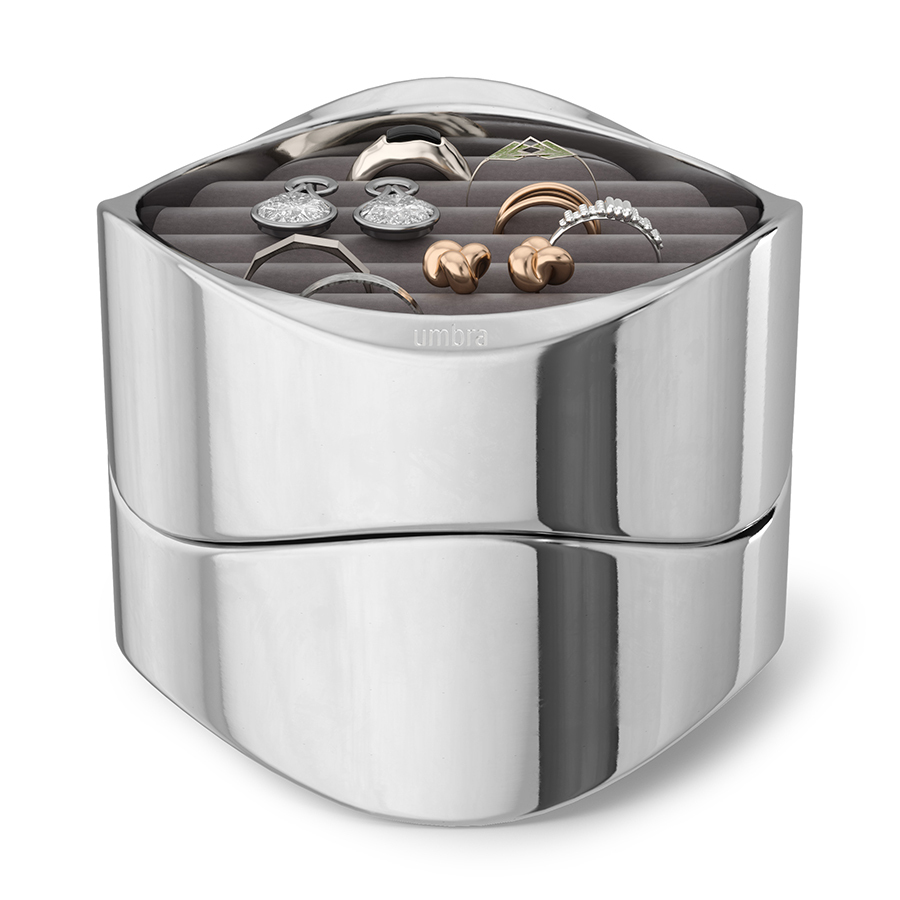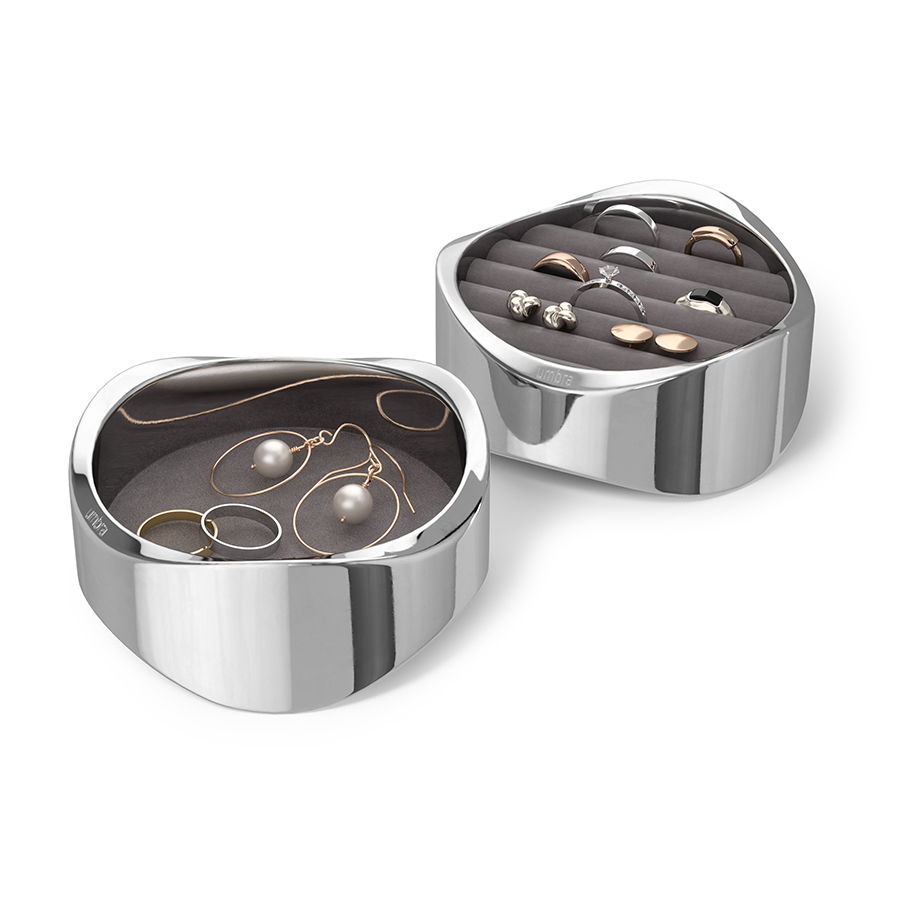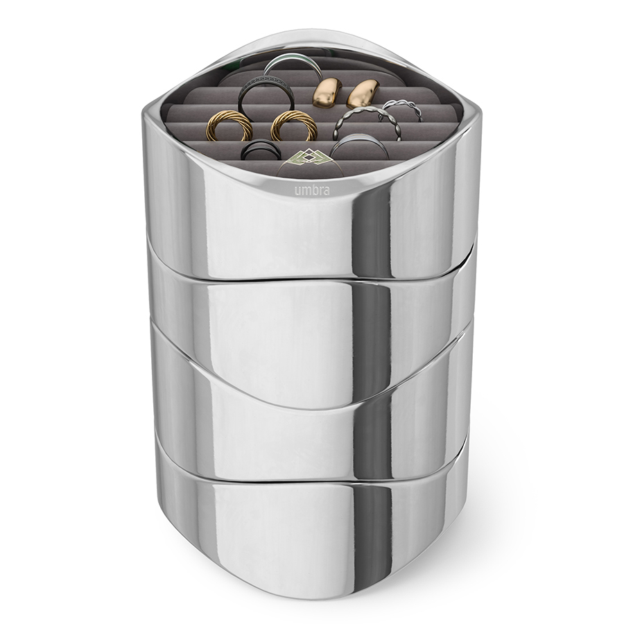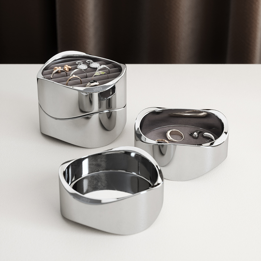 Органайзер для украшений Wavy – великолепное сочетание элегантности и функционального дизайна. Выполненный в цвете “хром”, он станет стильным акцентом на вашем туалетном столике и будет прекрасно гармонировать с другим декором. Органайзер имеет разборную конструкцию – вы можете легко разделить его на две составные части, каждая из которых имеет мягкое, бархатистое основание для бережного хранения колец, сережек и браслетов.