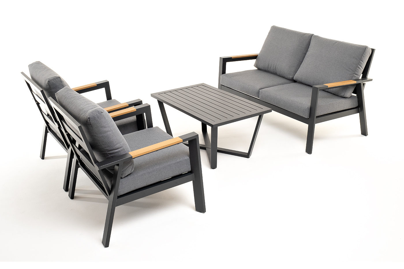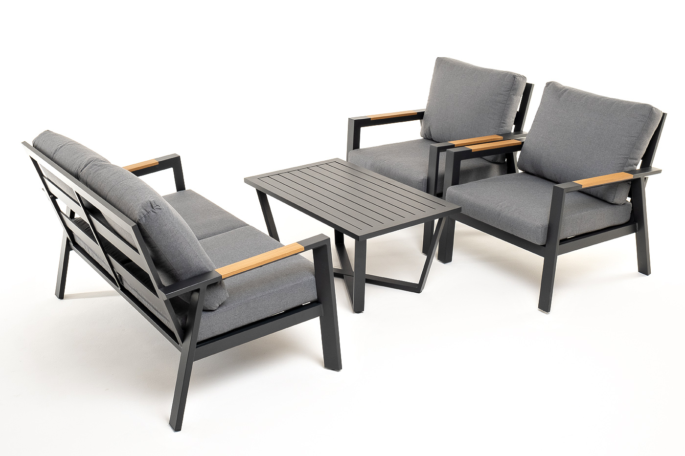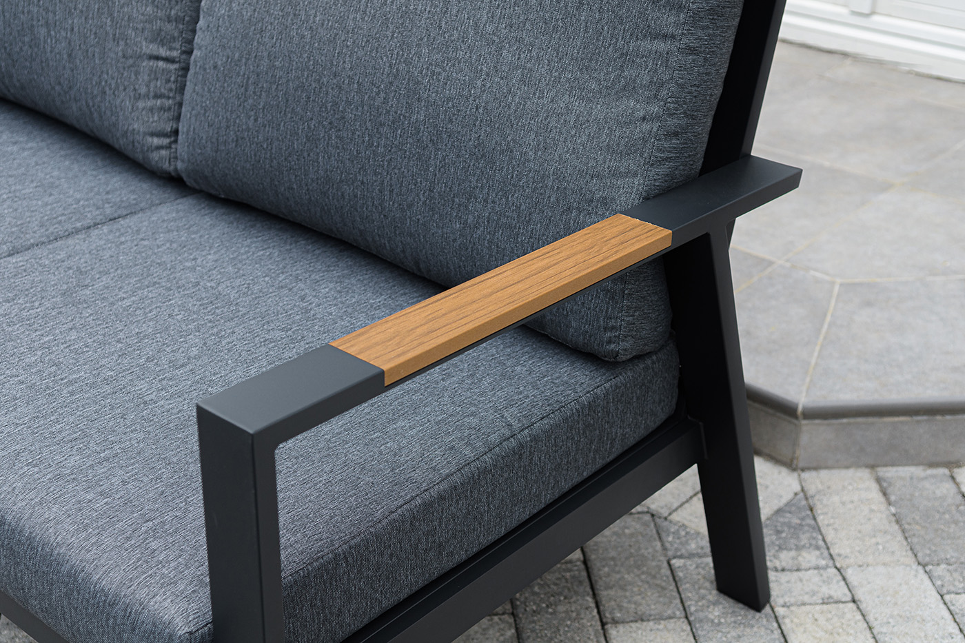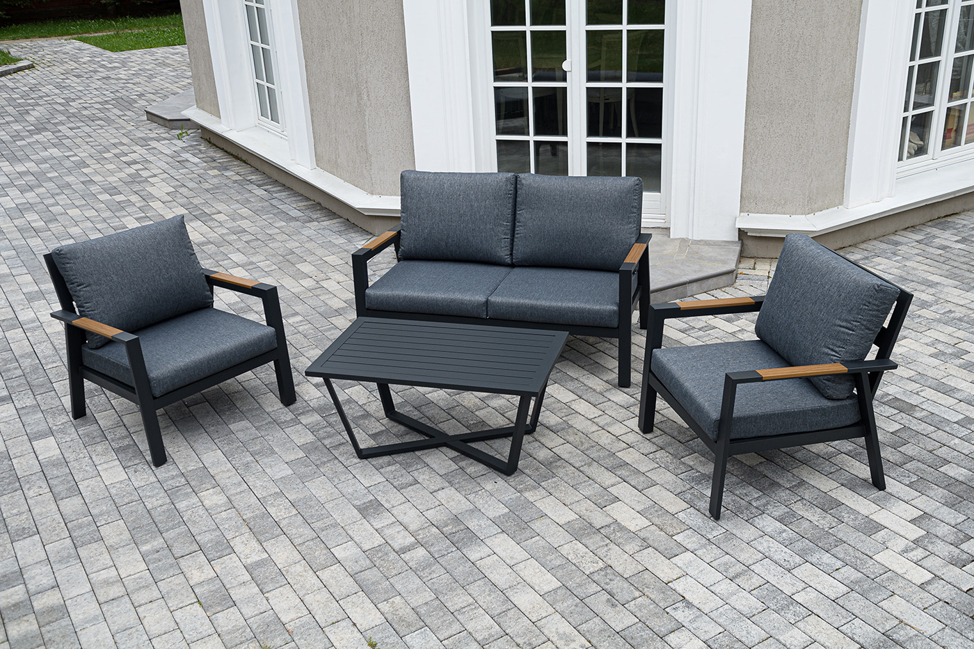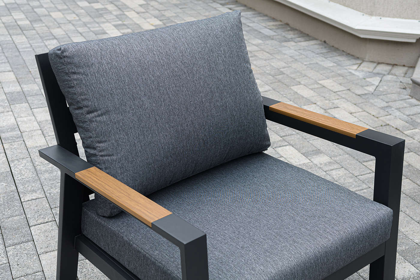Каркас мебели выполнен из прочного алюминия темно-серого цвета. На подлокотниках дивана и двух кресел установлен облицовочный материал из древесно полимерного композита (ДПК) цвет «дерево». Крепление к каркасу осуществляется на болтах с пластиковыми заглушками темно-серого цвета, которые не ржавеют. Комплект дополняют подушки со съёмными чехлами. Материал чехлов - 100% полиэстер плотностью 190гр/м2.
