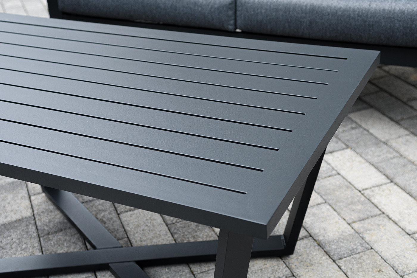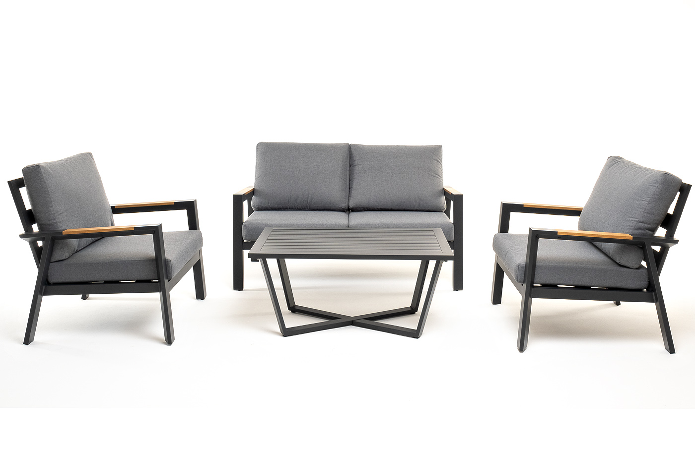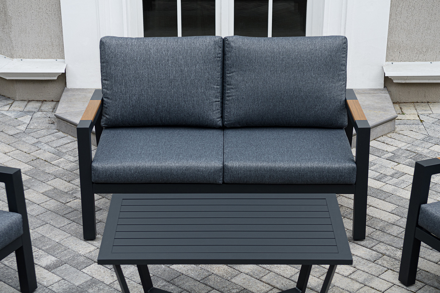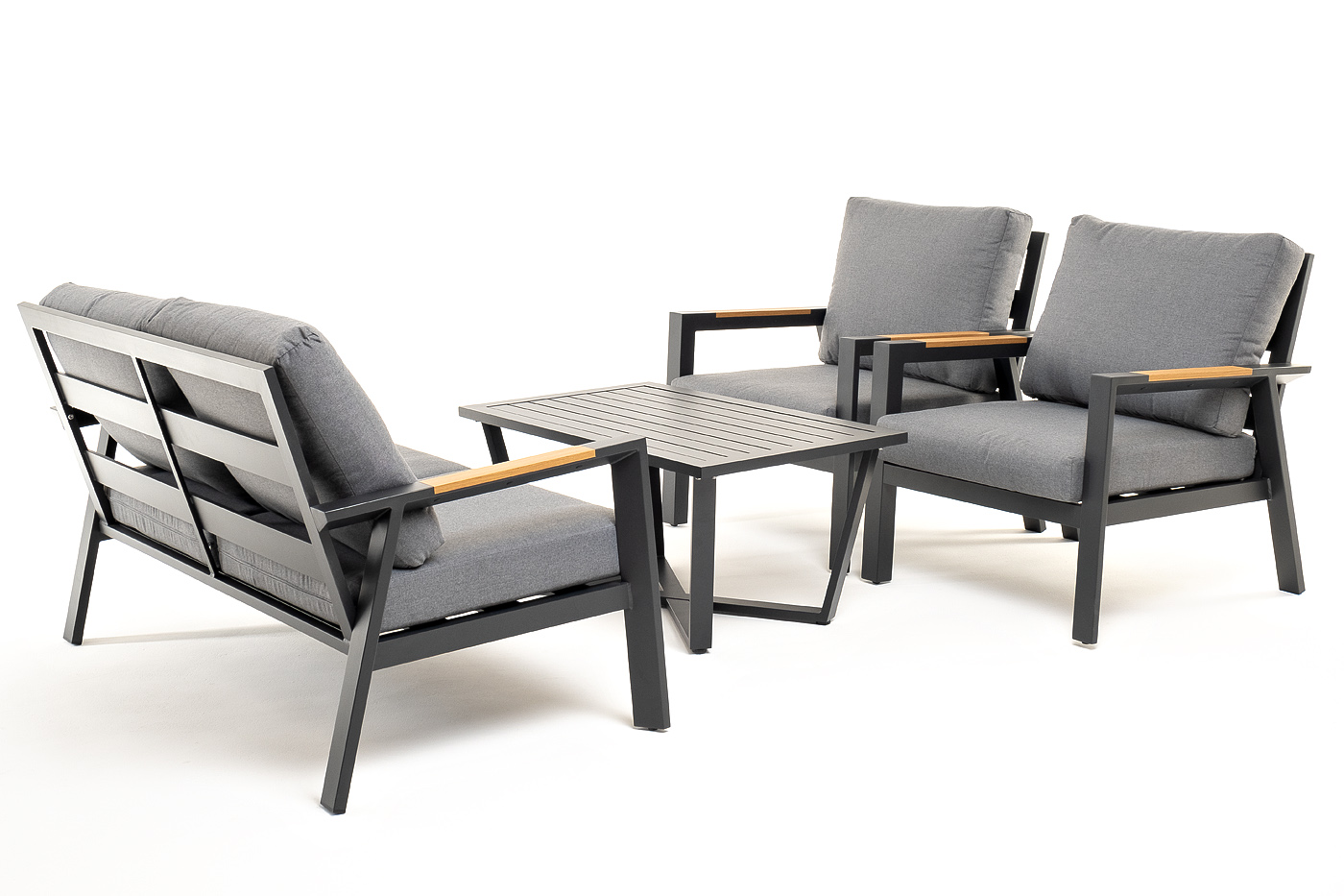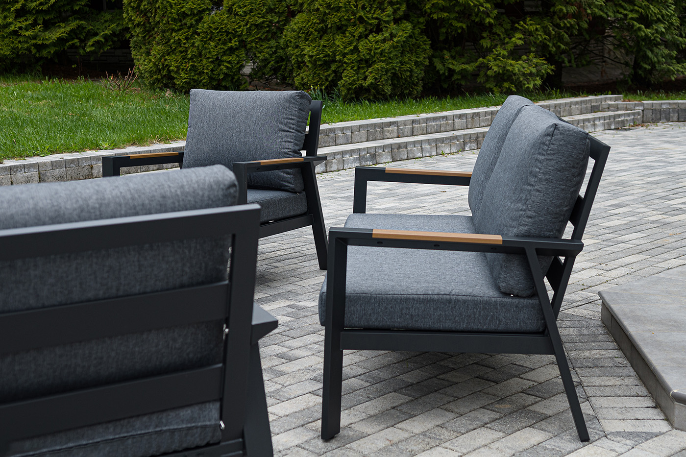 Каркас мебели выполнен из прочного алюминия темно-серого цвета. На подлокотниках дивана и двух кресел установлен облицовочный материал из древесно полимерного композита (ДПК) цвет «дерево». Крепление к каркасу осуществляется на болтах с пластиковыми заглушками темно-серого цвета, которые не ржавеют. Комплект дополняют подушки со съёмными чехлами. Материал чехлов - 100% полиэстер плотностью 190гр/м2.
