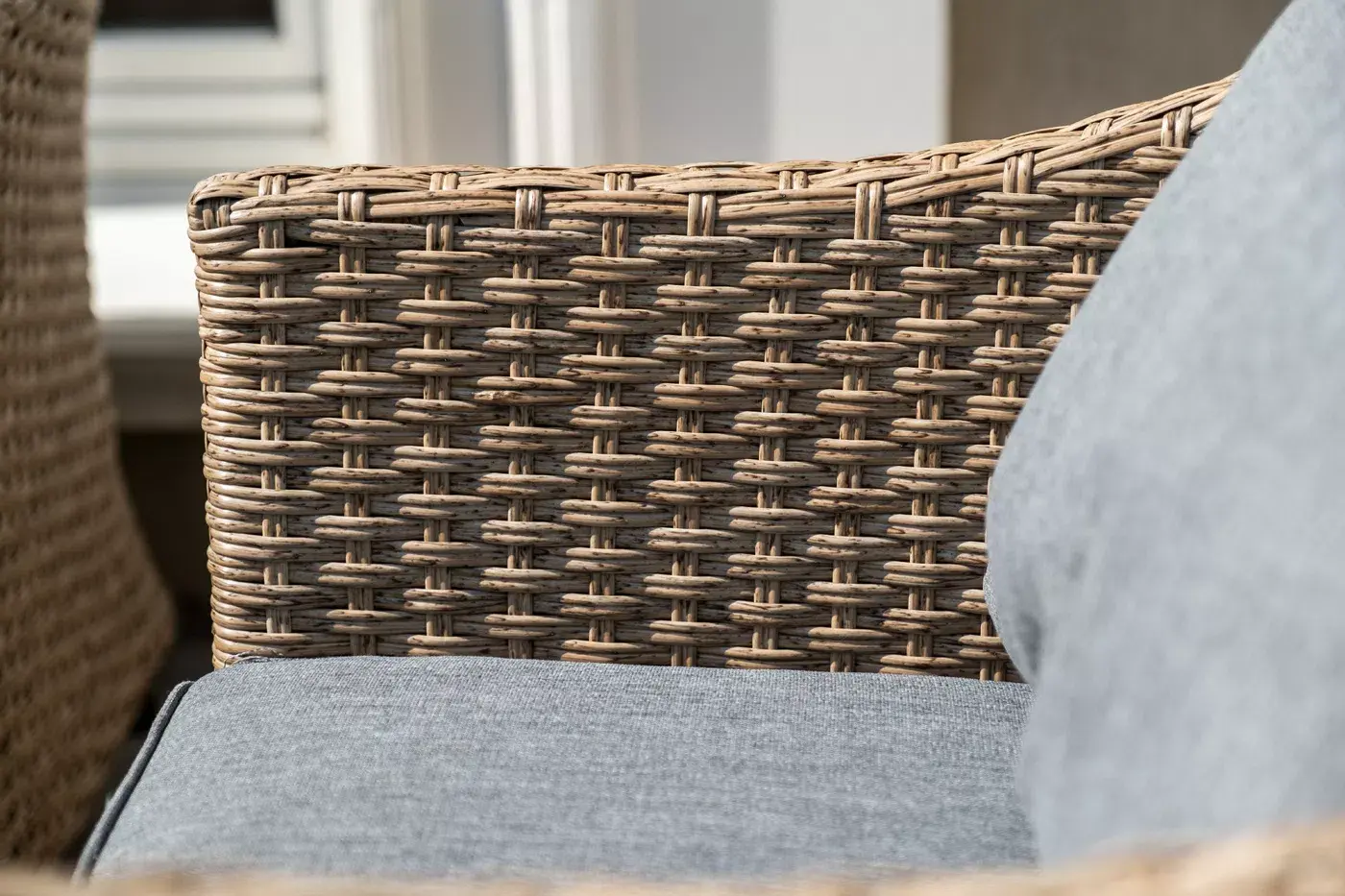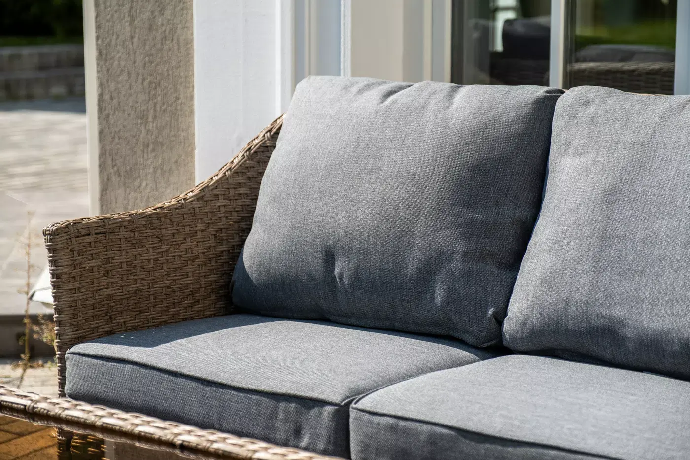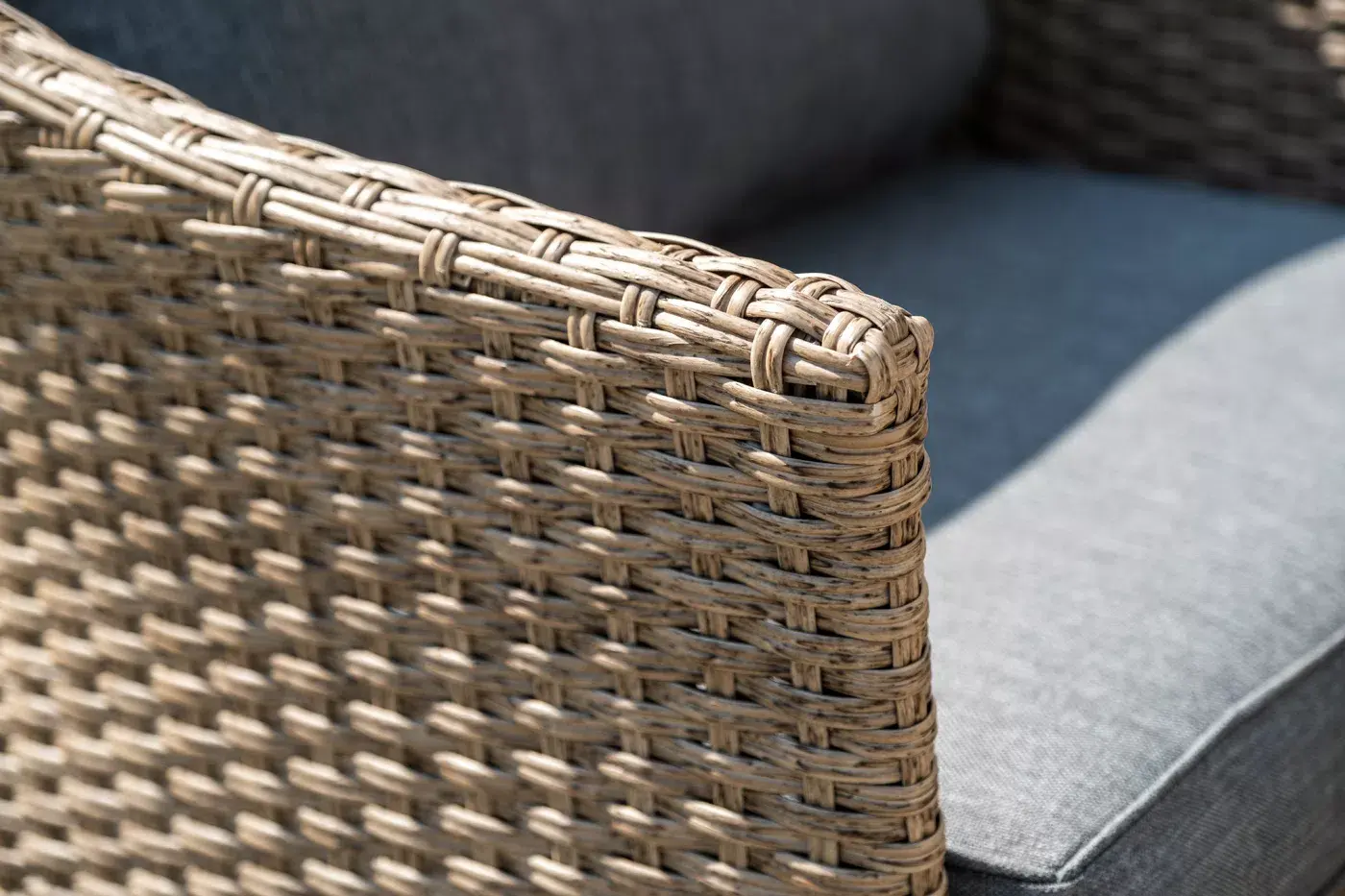 Оплетка выполнена вручную искусственным ротангом соломенного цвета, диван и кресла укомплектованы подушками из 100% полиэстера.