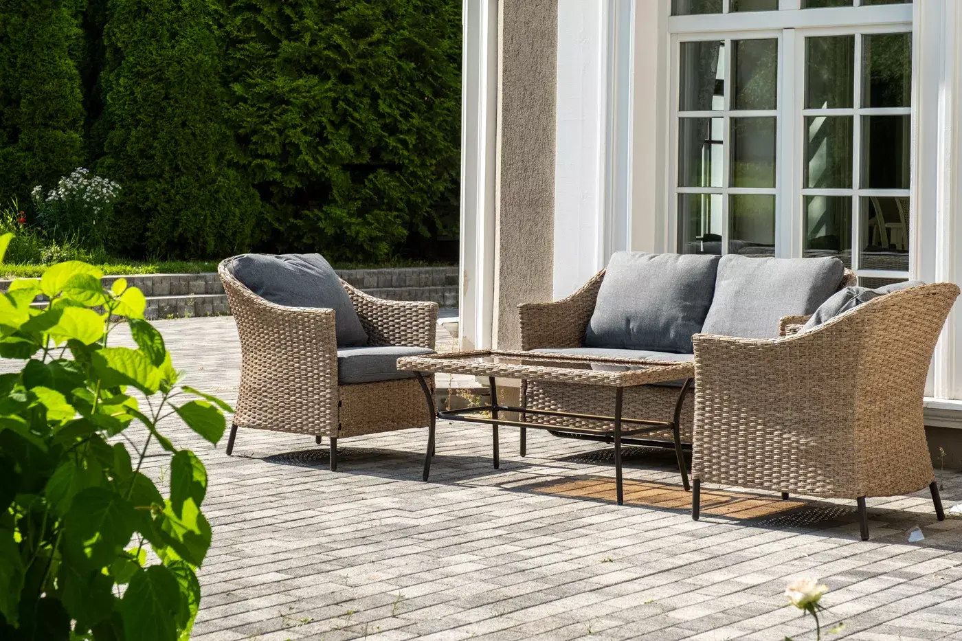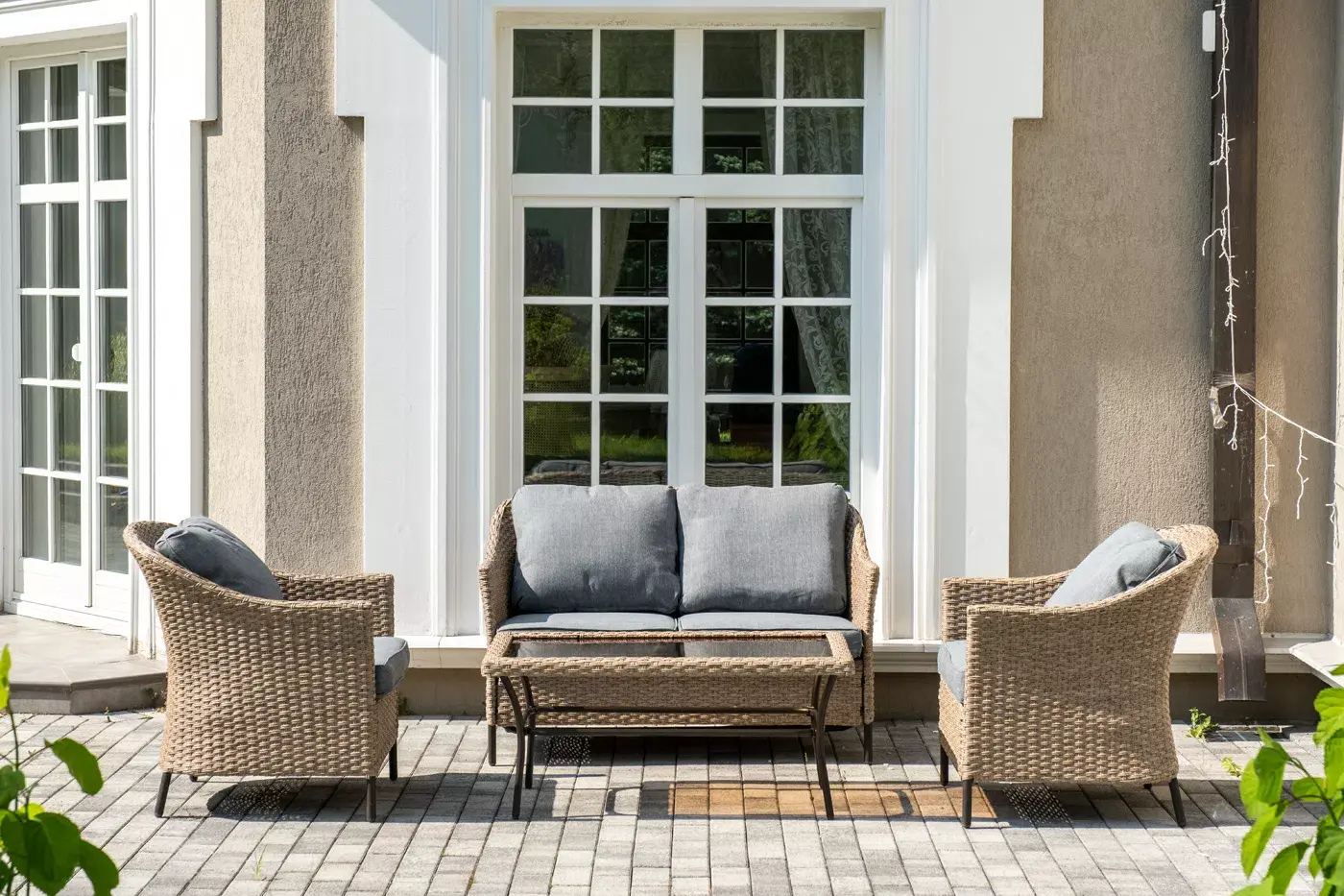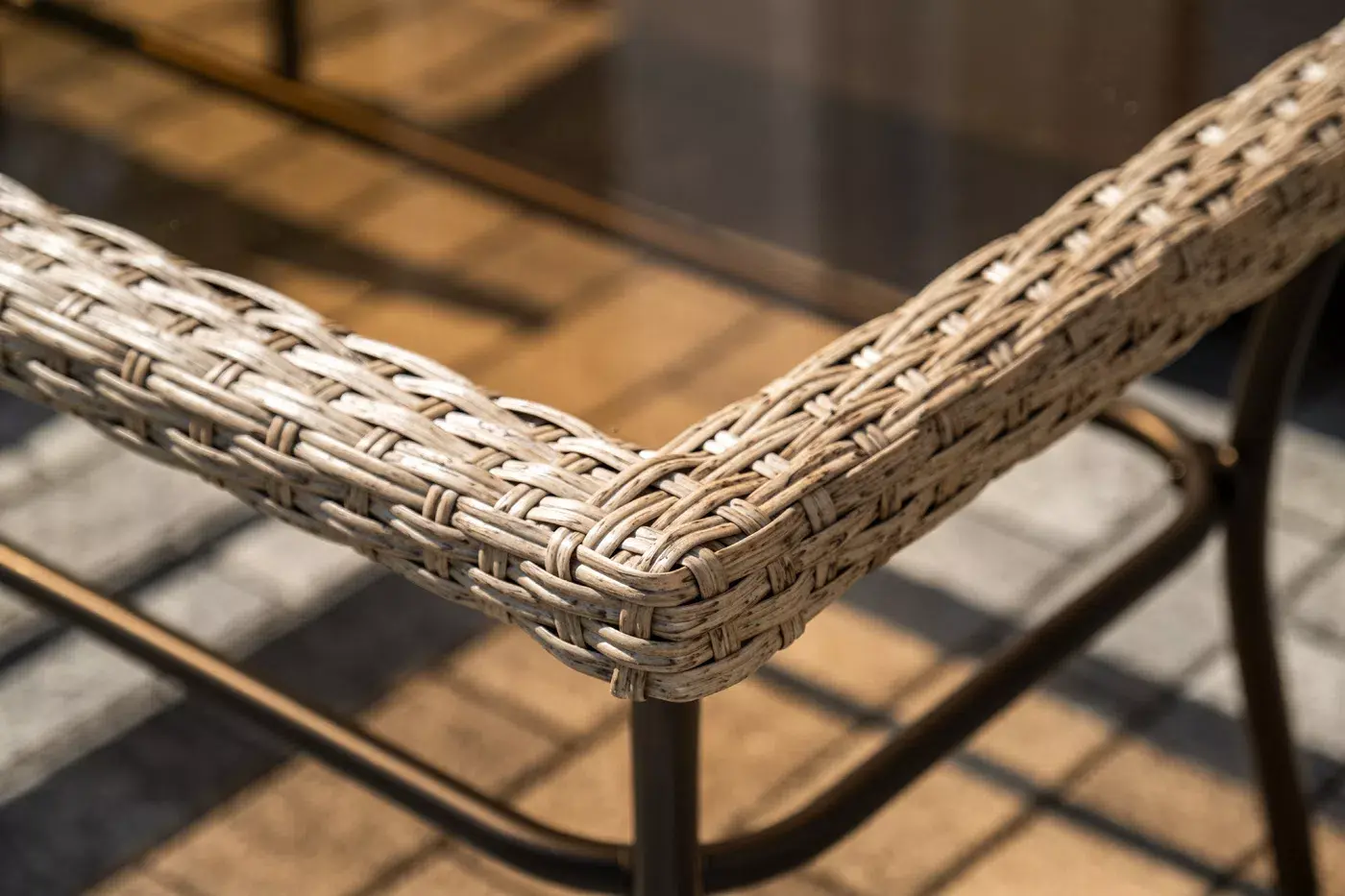 Оплетка выполнена вручную искусственным ротангом соломенного цвета, диван и кресла укомплектованы подушками из 100% полиэстера.