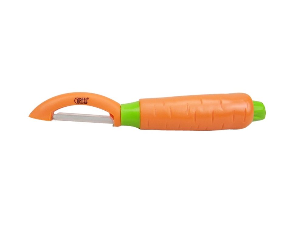 Овощечистка Gipfel Corona 9764. Имеет Р-форму, рукоятка выполнена в форме моркови. Рабочая часть выполнена из нержавеющей стали, ручка пластиковая.