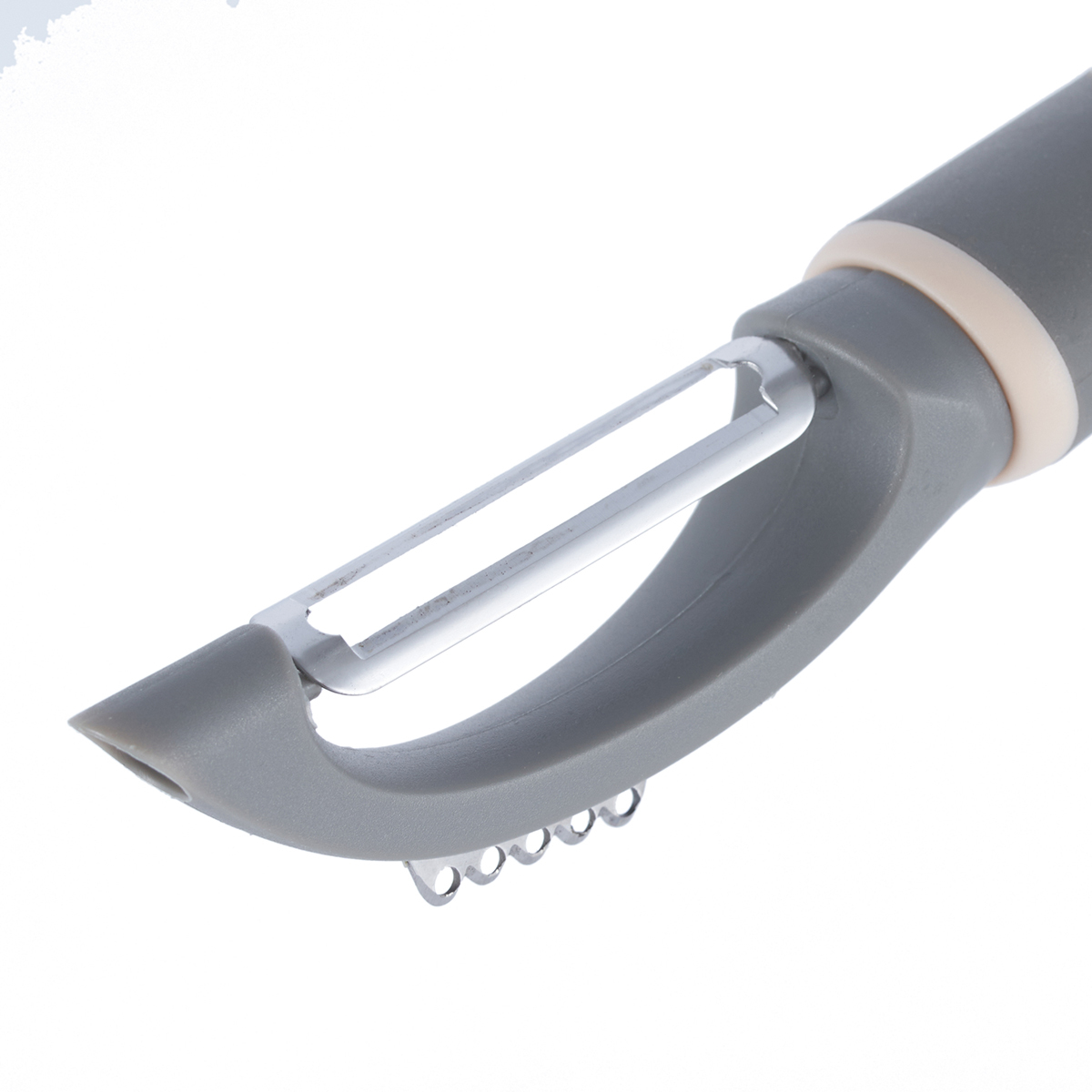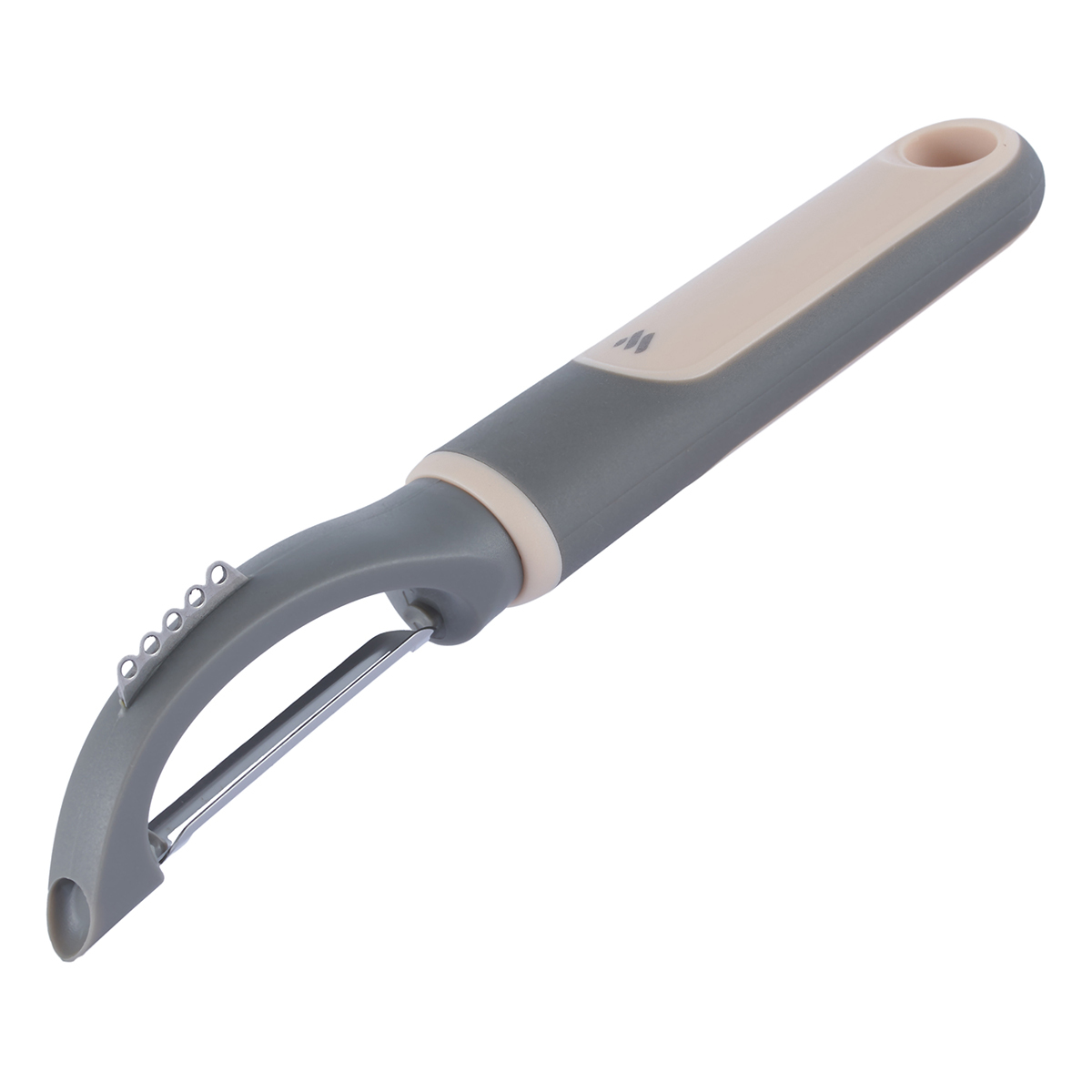 Рабочая часть изготовлена из качественной нержавеющей стали, материала прочного и долговечного. При правильной эксплуатации лезвие остается острым длительное время. Угол режущей поверхности позволяет срезать ультратонкий слой кожуры.