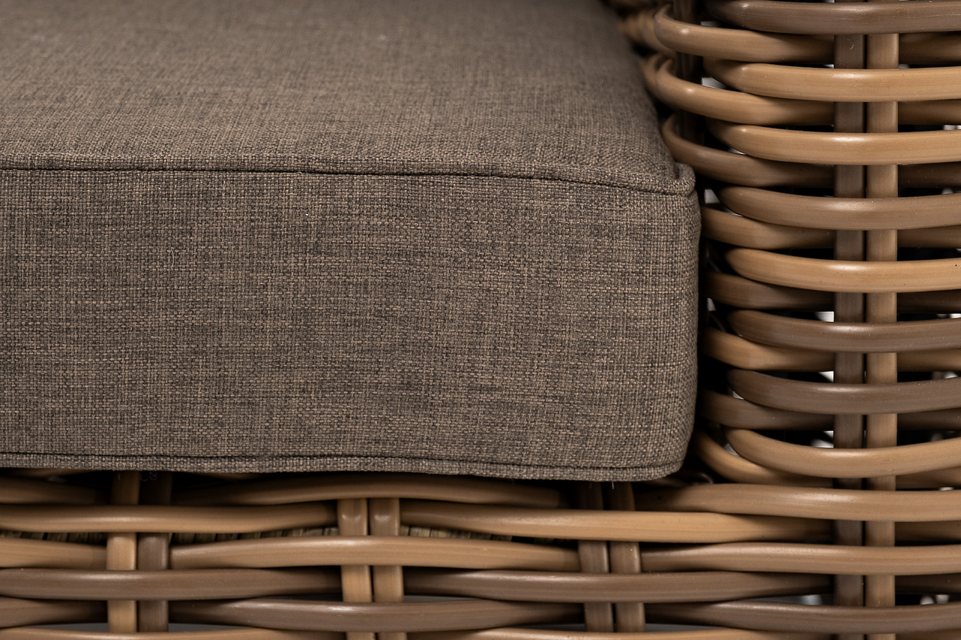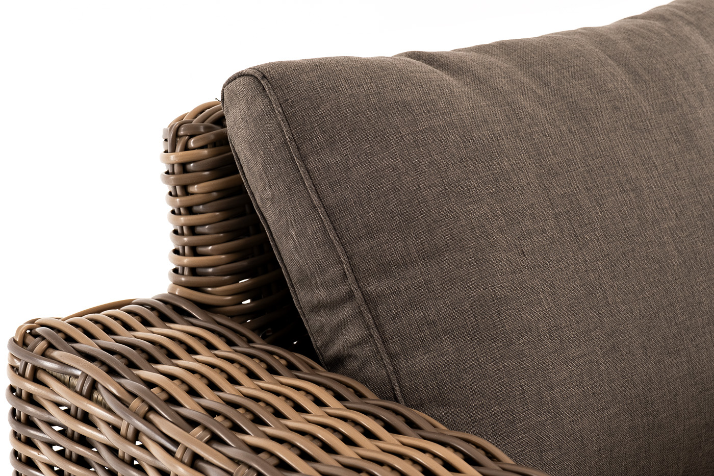 Кресло оснащено каркасом из прочного алюминия, ручное круглое плетение является основным декоративным элементом мебели. Оно выполнено из искусственного ротанга в соломенном цвете.