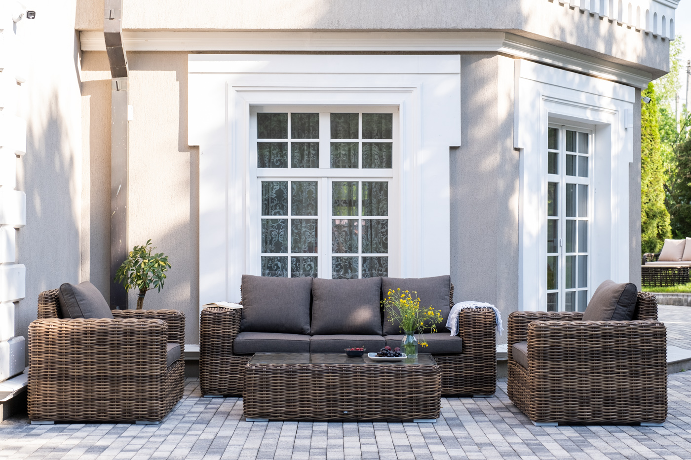 Плетеная мебель дополнена удобными подушками в серых чехлах. При их изготовлении используют полиэстер, плотность – 300гр/м2. Он обрабатывается влагоотталкивающей пропиткой для повышения защитных свойств материала.
