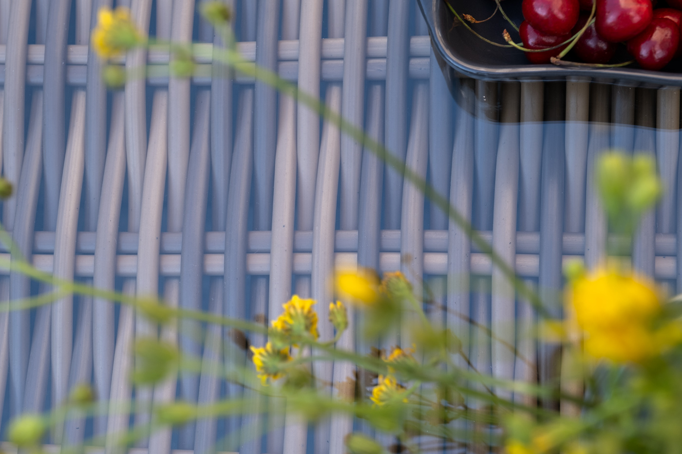 Каркас столика изготовлен из алюминия, вручную оплетенного круглым искусственным ротангом. Столешница из закаленного стекла толщиной 5 мм. Благодаря износостойким материалам, стол пригоден для использования на улице при любой погоде и не требует специальных условий хранения.