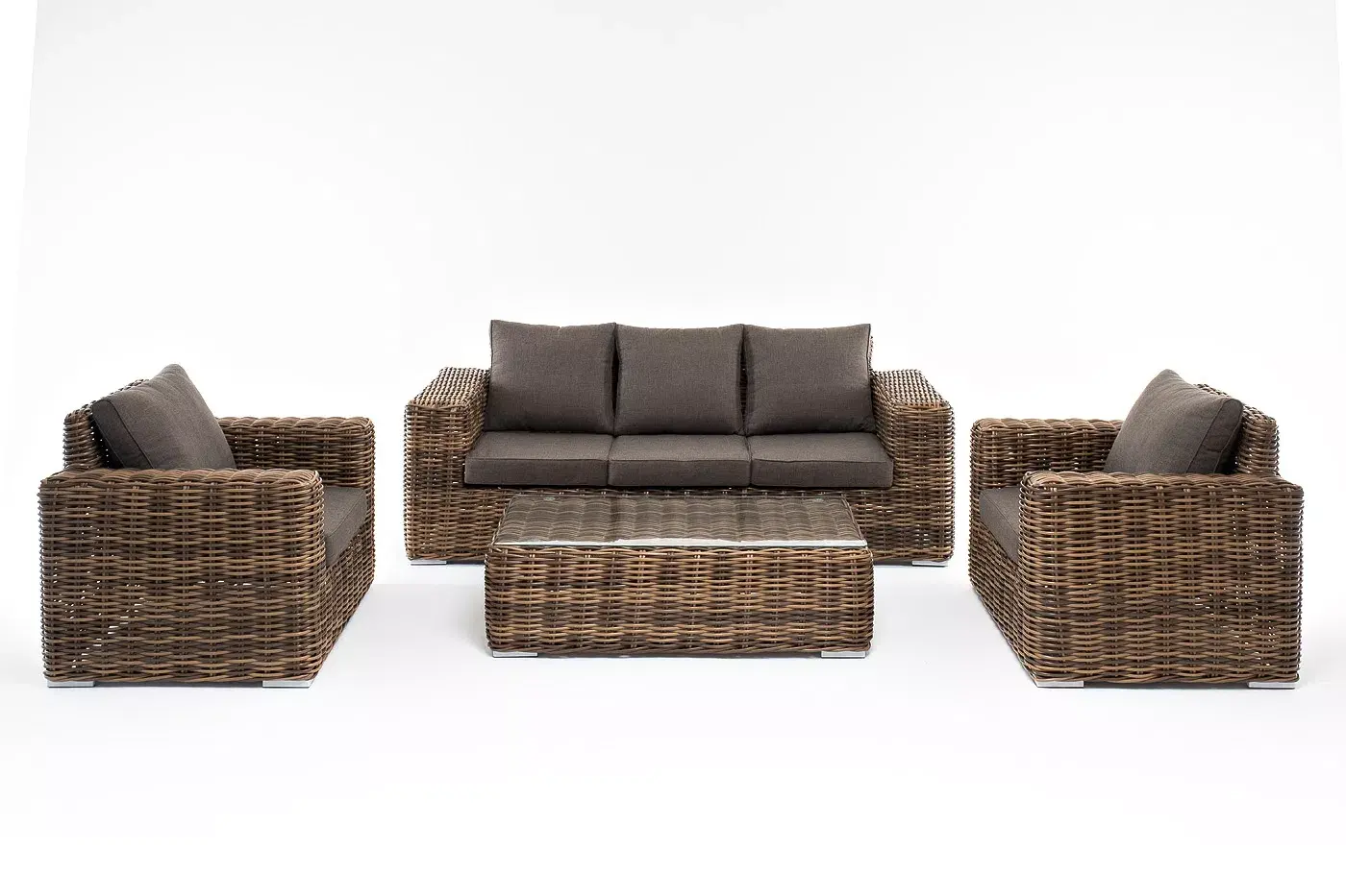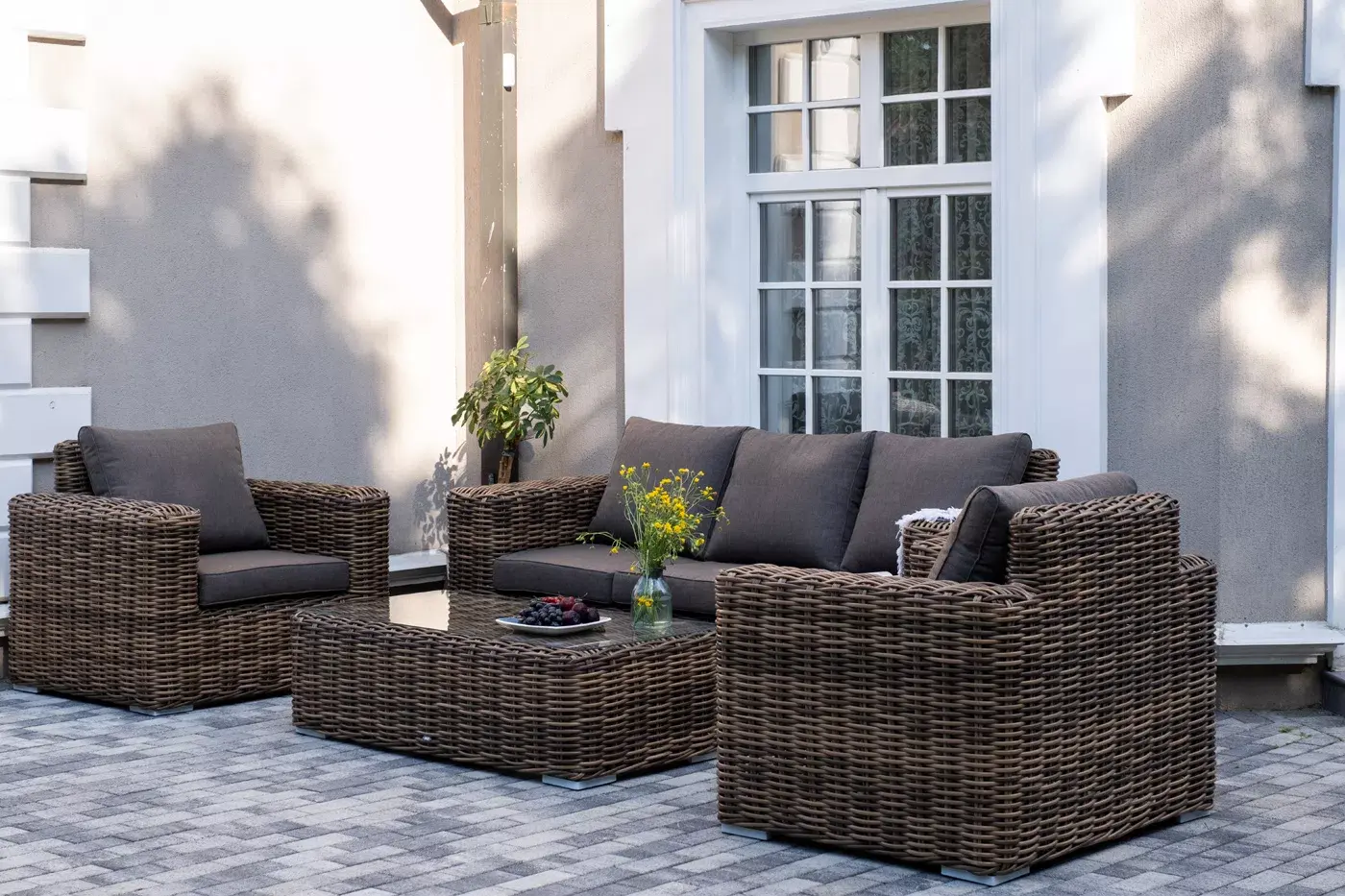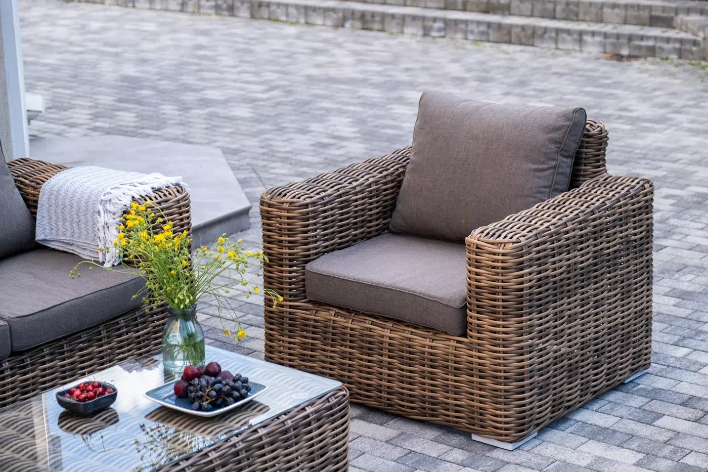 Плетеная мебель дополнена удобными подушками в серых чехлах. При их изготовлении используют полиэстер, плотность – 300гр/м2. Он обрабатывается влагоотталкивающей пропиткой для повышения защитных свойств материала.