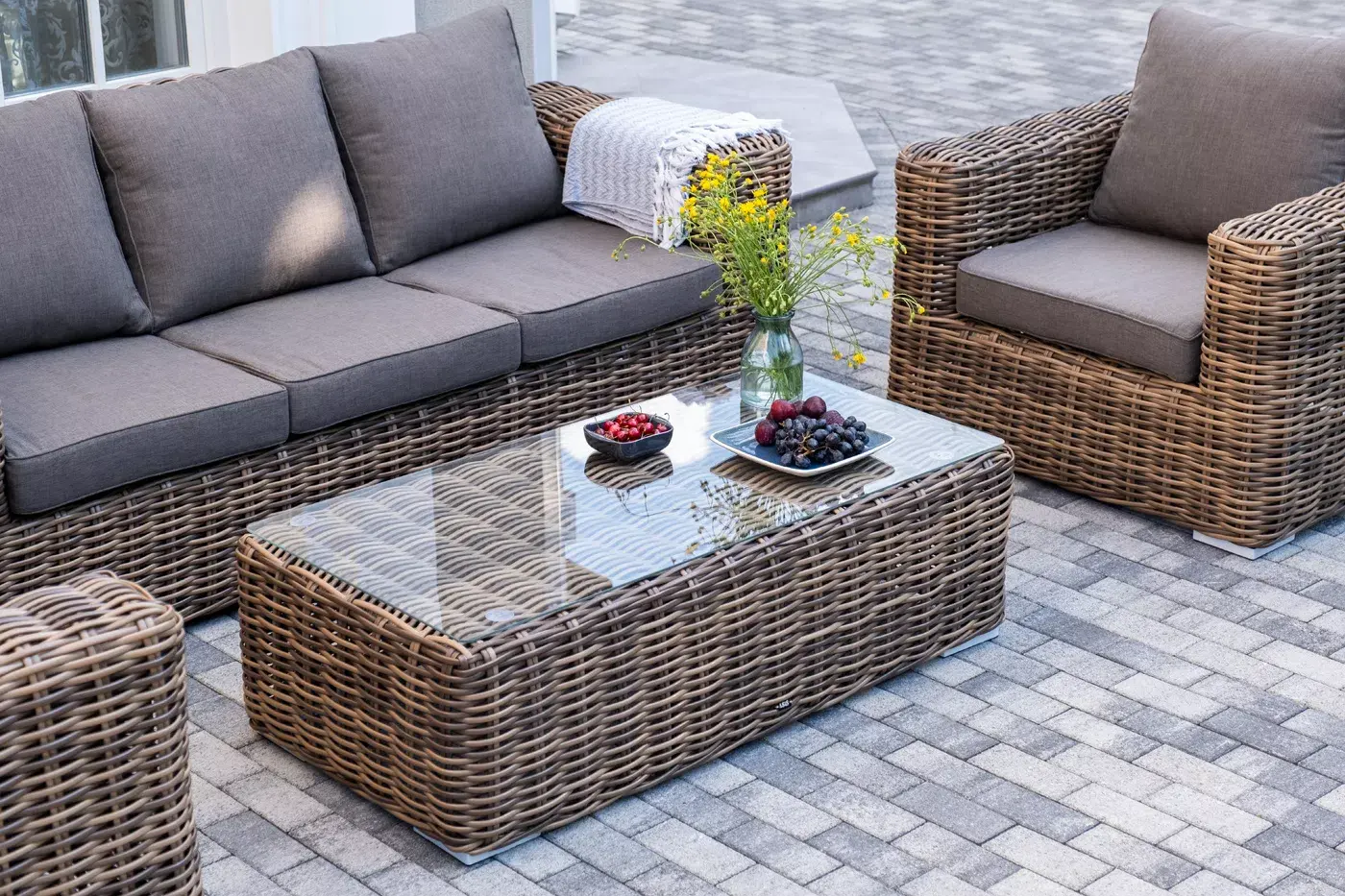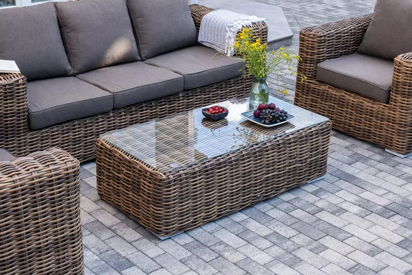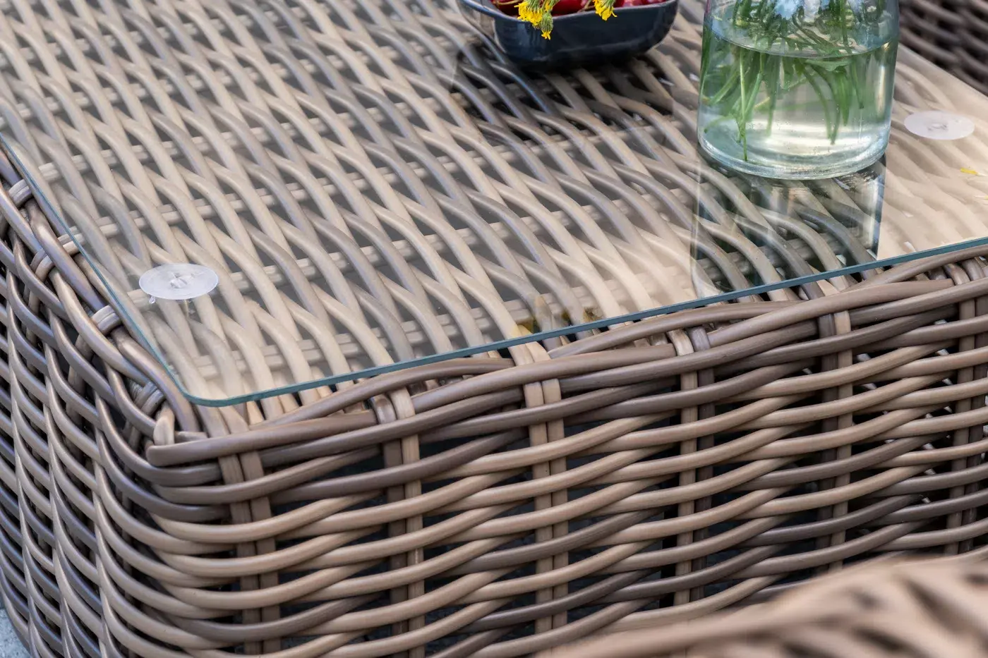 Каркас столика изготовлен из алюминия, вручную оплетенного круглым искусственным ротангом. Столешница из закаленного стекла толщиной 5 мм. Благодаря износостойким материалам, стол пригоден для использования на улице при любой погоде и не требует специальных условий хранения.