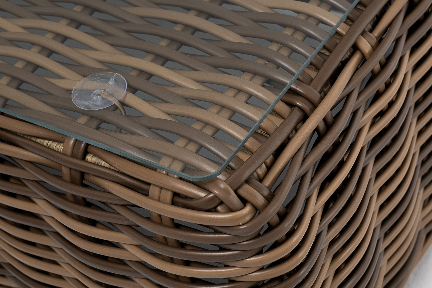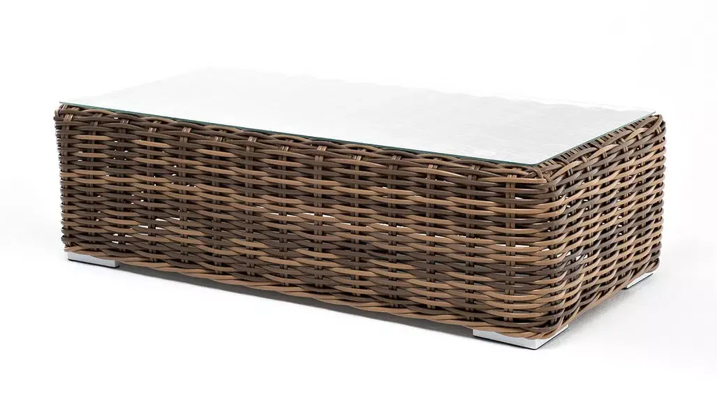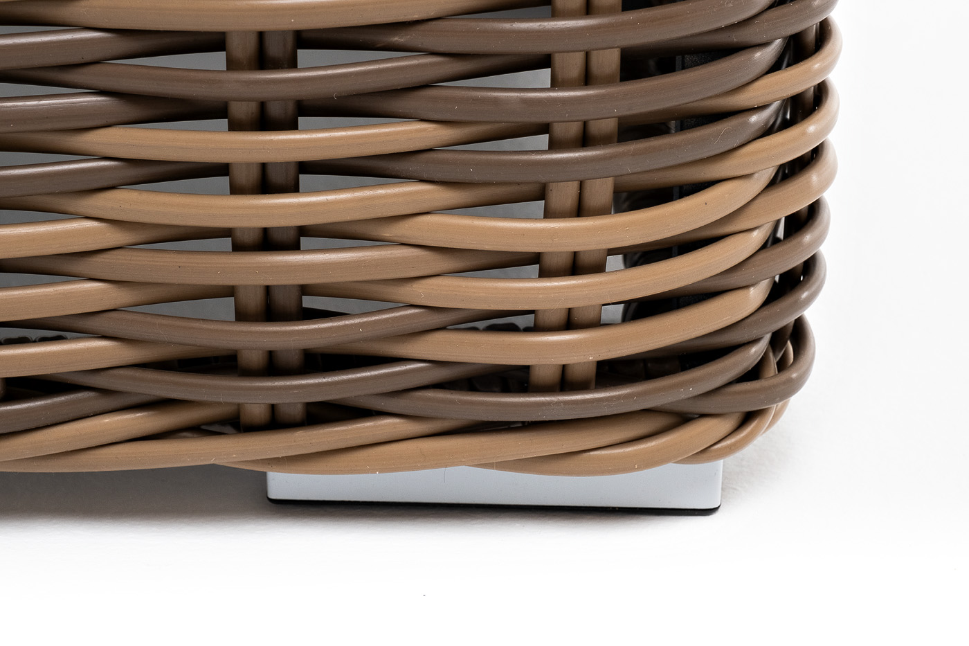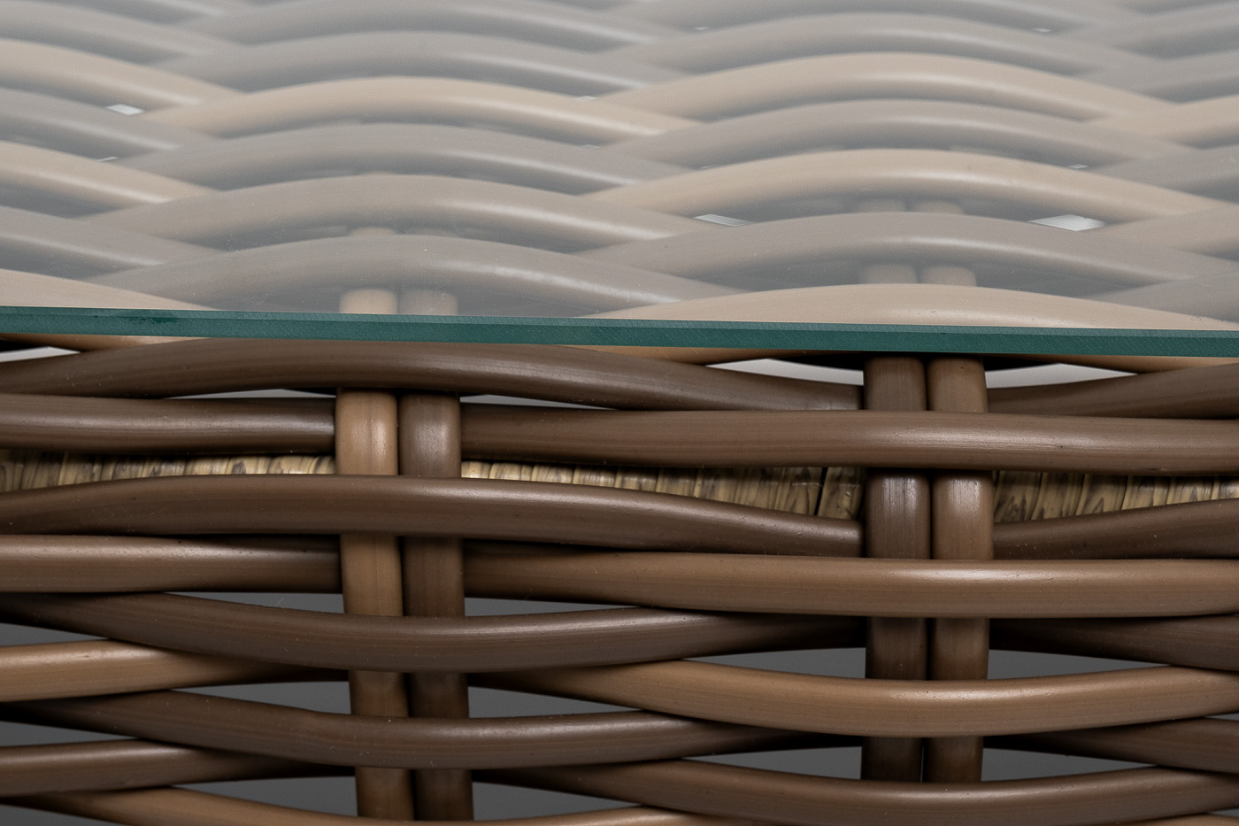 Каркас столика изготовлен из алюминия, вручную оплетенного круглым искусственным ротангом.