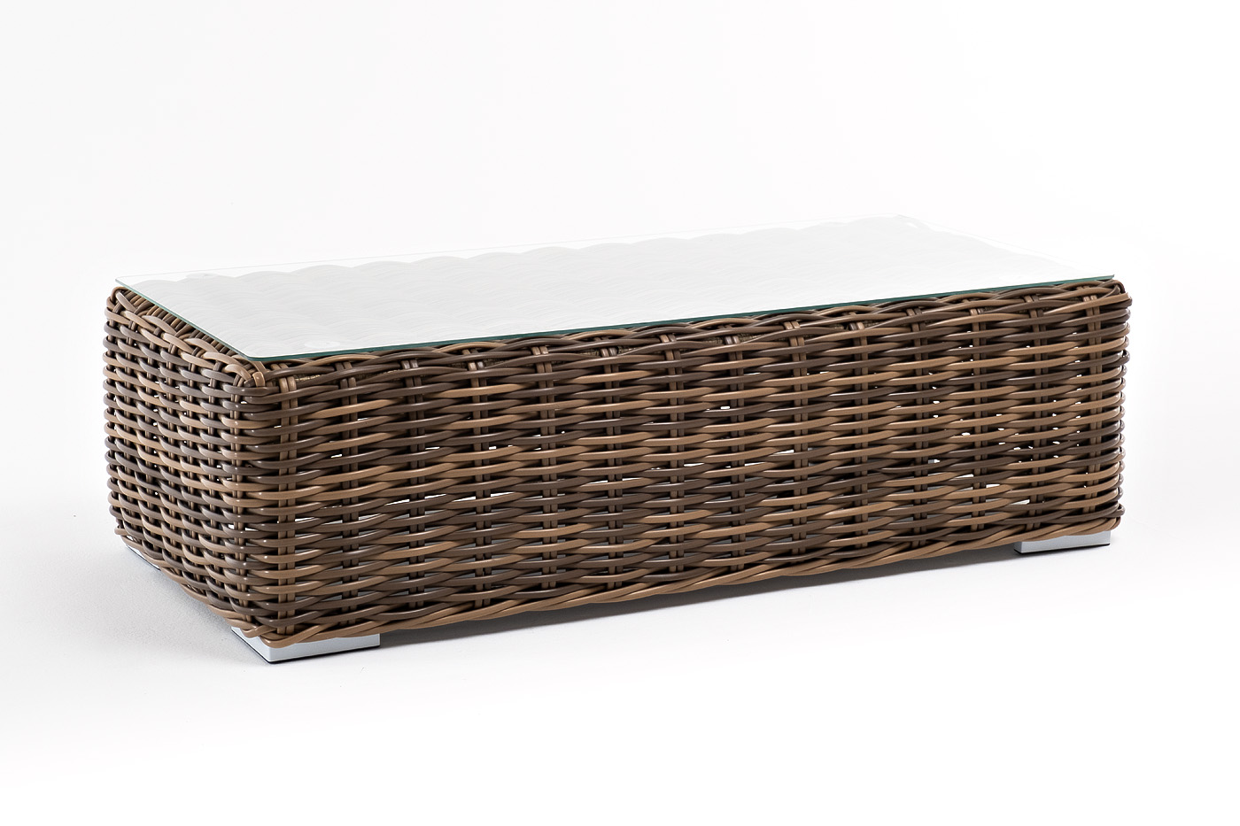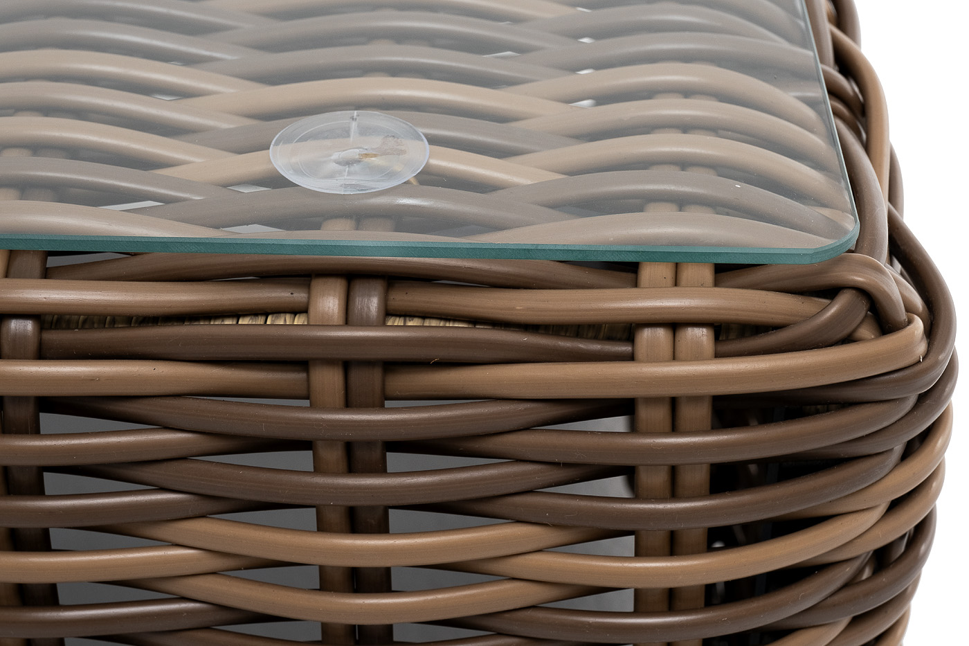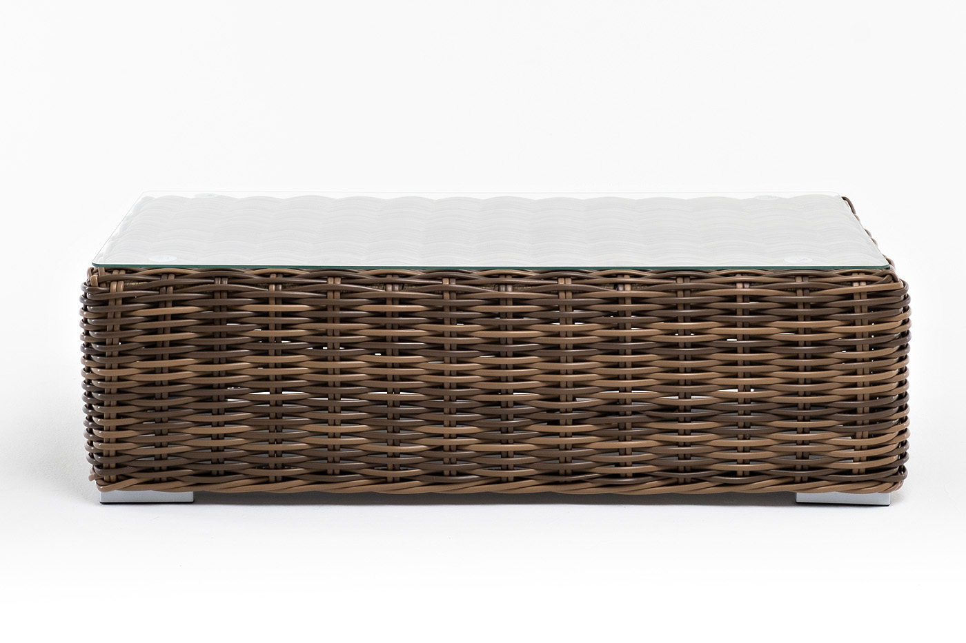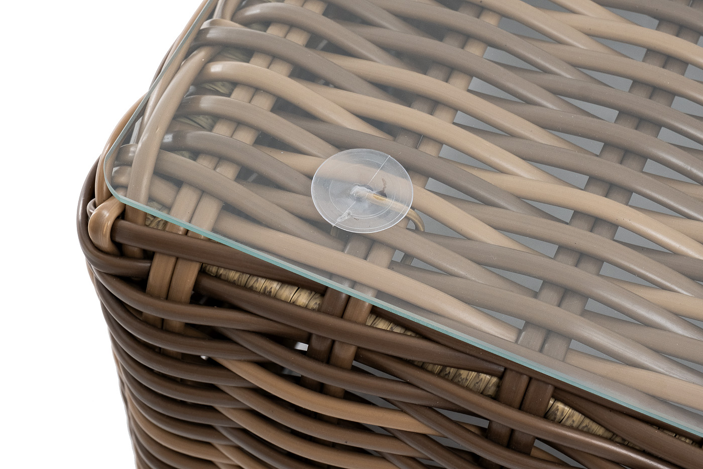 Каркас столика изготовлен из алюминия, вручную оплетенного круглым искусственным ротангом.