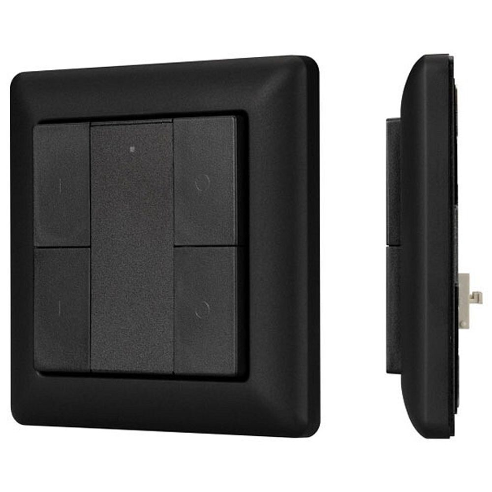 Встраиваемая кнопочная черная пластиковая панель для работы по протоколу DALI; Управление 2-мя группами; Установка номера первой группы выполняется переключателями на корпусе; Функции каждой группы (вкл/выкл/диммирование).