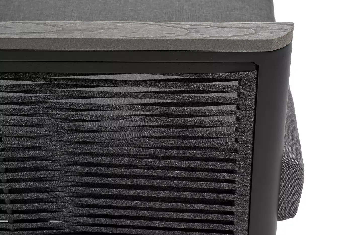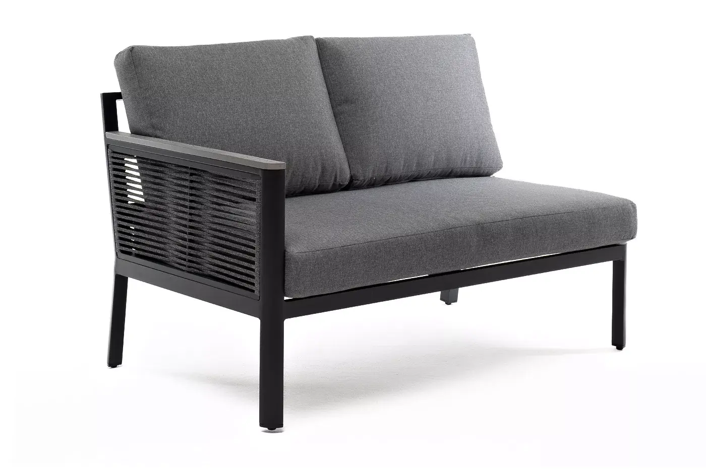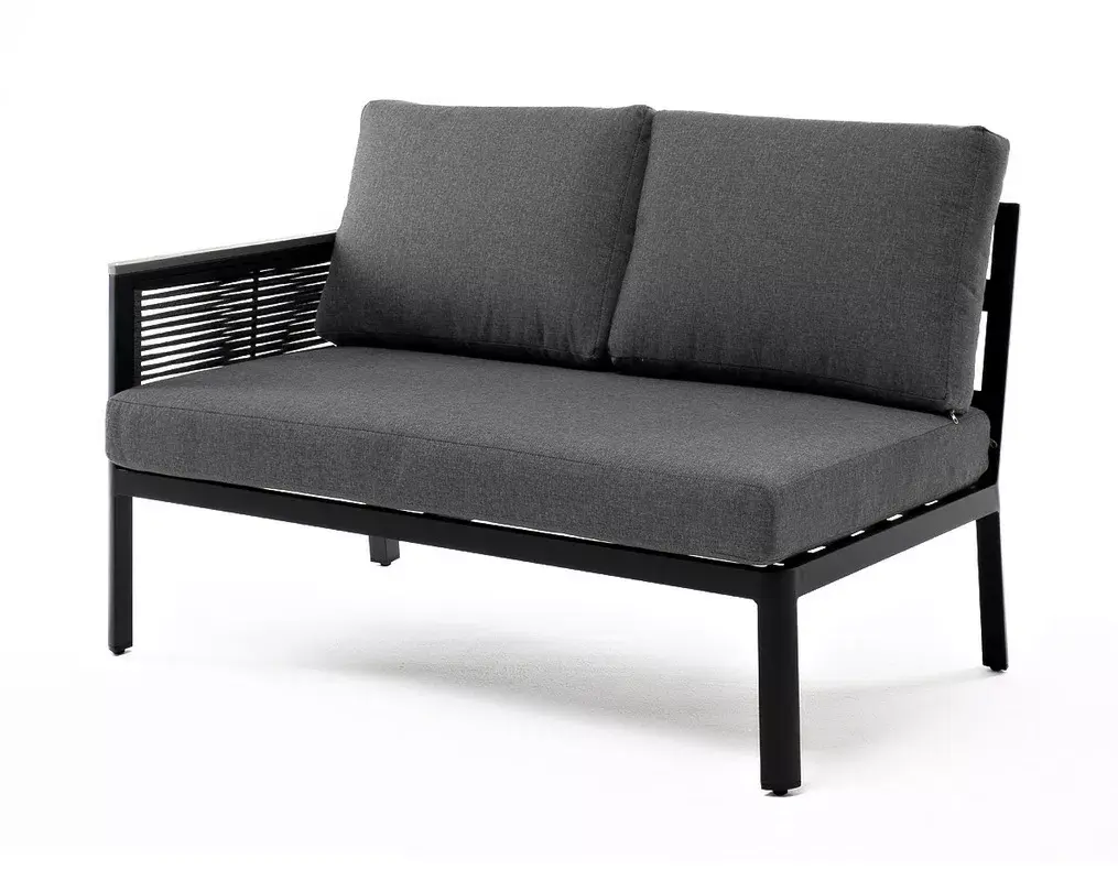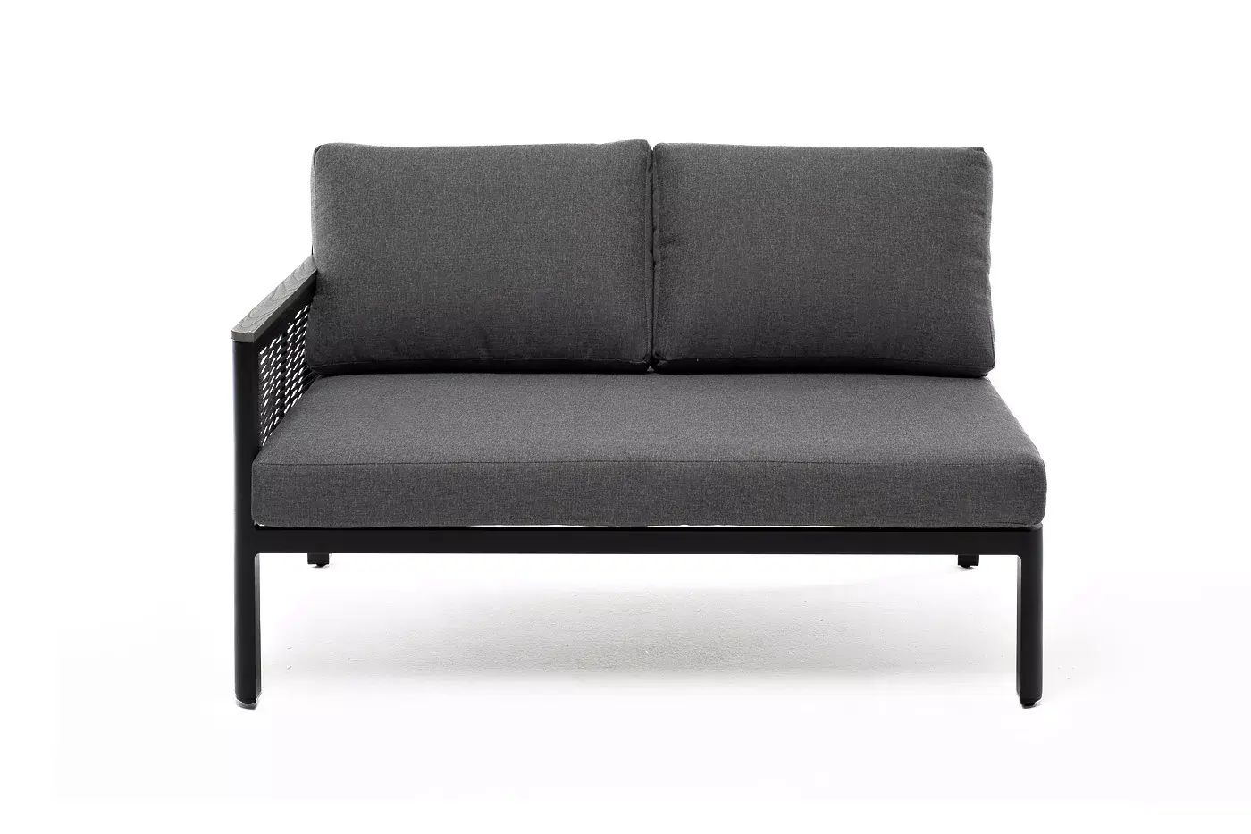 «Париж» модуль диванный правый изготовлен из алюминиевого каркаса темно-серого цвета. Боковины оплетены роупом - эластичными лентами из полиэфирных волокон, цвет серый.