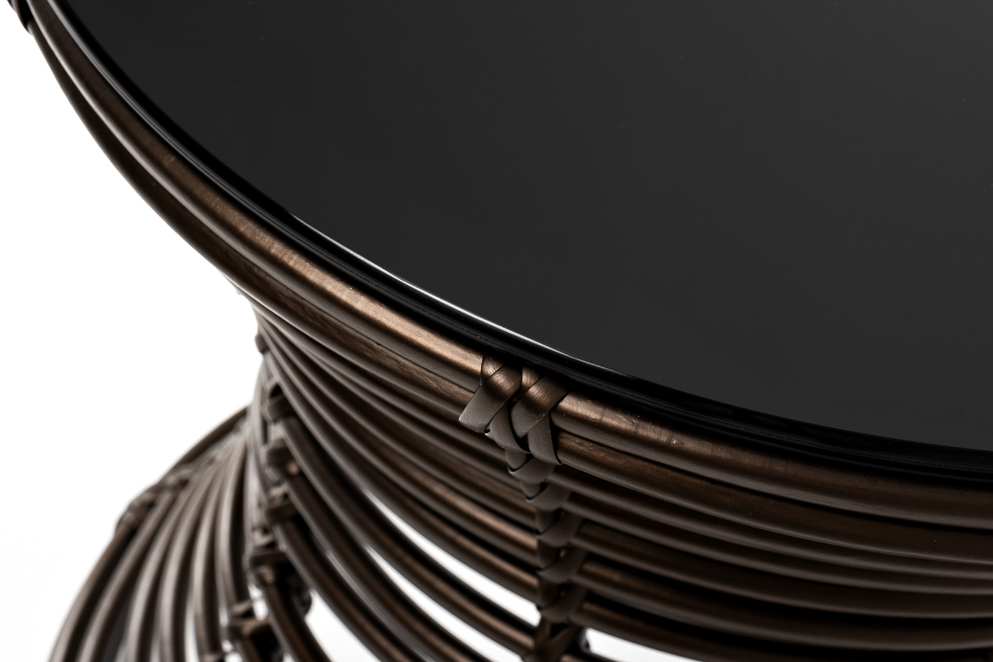 Каркас столика изготовлен из алюминия, вручную оплетенного круглым искусственным ротангом.