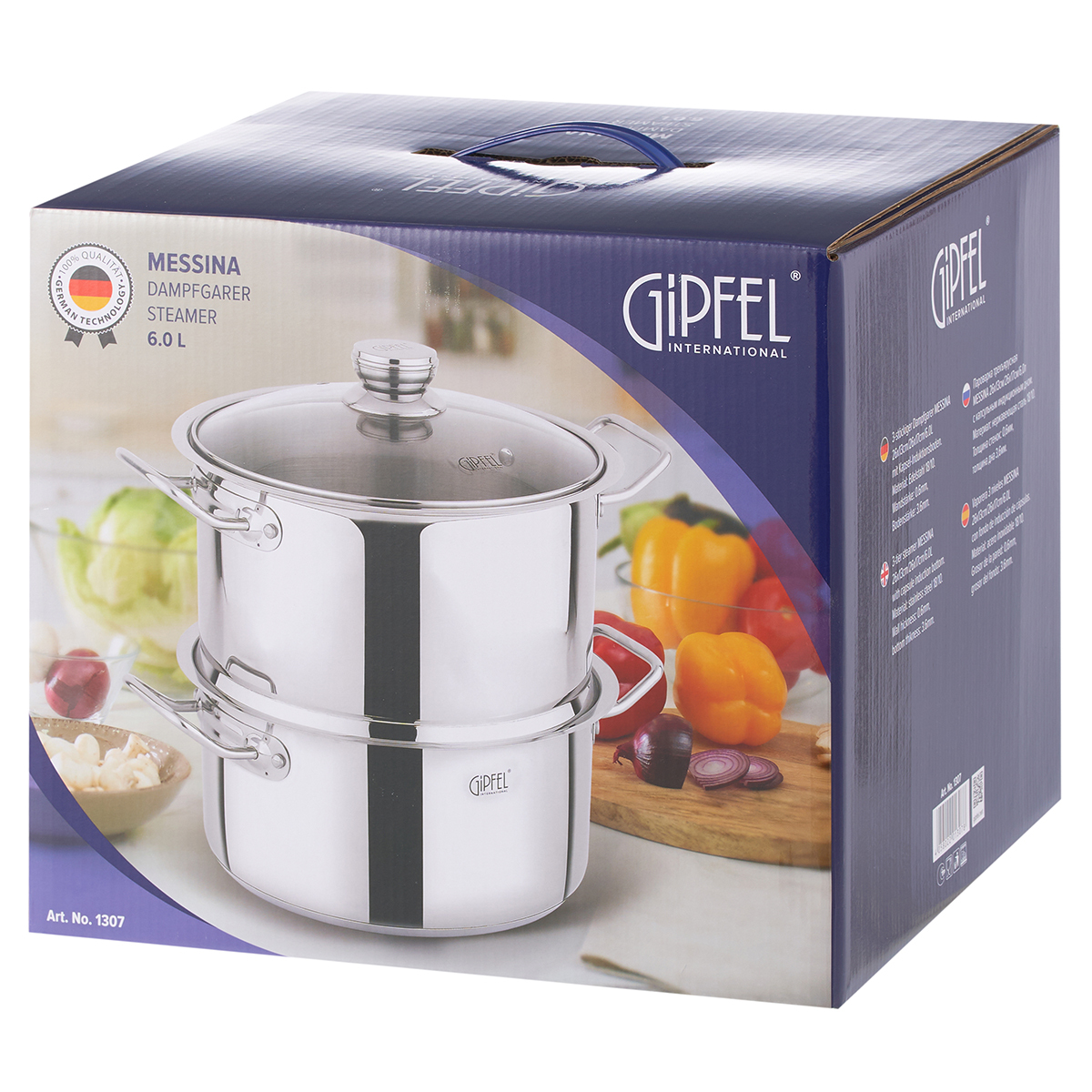 Пароварка трехъярусная GIPFEL MESSINA 1307 объемом 6.0 л. Материал: нержавеющая сталь 18/10. Материал ручки: нержавеющая сталь 201. Индукционное дно. Высота нижней части - 13 см, верхней части - 17см. Диаметр дна - 24 см. Диаметр под крышку - 26 см. В комплекте идут три решетки на ножках.